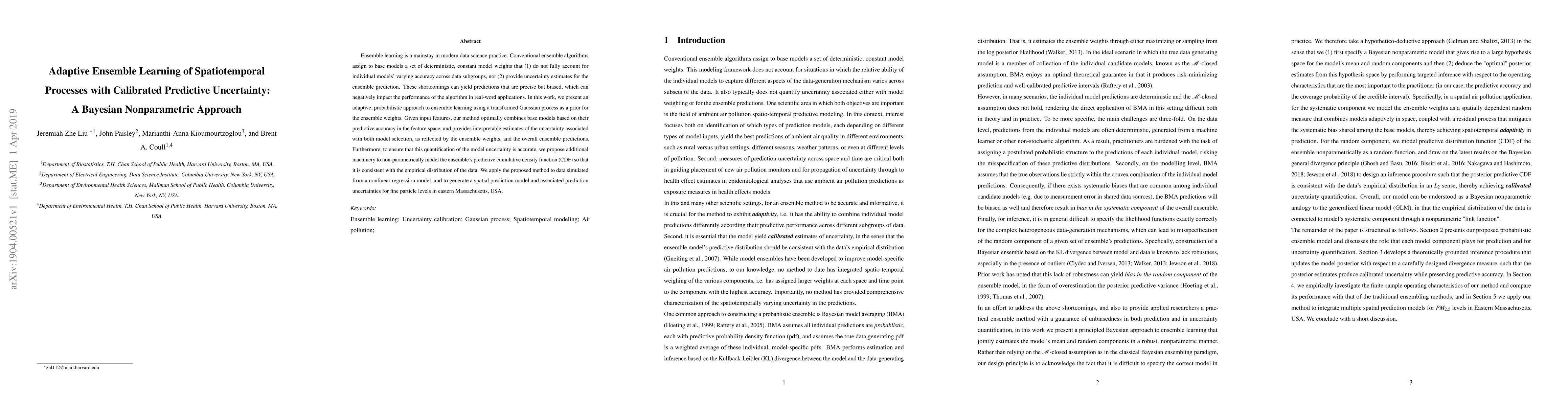 Ensemble learning is a mainstay in modern data science practice. Conventional ensemble algorithms assign to base models a set of deterministic, constant model weights that (1) do not fully account for individual models' varying accuracy across data subgroups, nor (2) provide uncertainty estimates for the ensemble prediction. These shortcomings can yield predictions that are precise but biased, which can negatively impact the performance of the algorithm in real-word applications. In this work, we present an adaptive, probabilistic approach to ensemble learning using a transformed Gaussian process as a prior for the ensemble weights. Given input features, our method optimally combines base models based on their predictive accuracy in the feature space, and provides interpretable estimates of the uncertainty associated with both model selection, as reflected by the ensemble weights, and the overall ensemble predictions. Furthermore, to ensure that this quantification of the model uncertainty is accurate, we propose additional machinery to non-parametrically model the ensemble's predictive cumulative density function (CDF) so that it is consistent with the empirical distribution of the data. We apply the proposed method to data simulated from a nonlinear regression model, and to generate a spatial prediction model and associated prediction uncertainties for fine particle levels in eastern Massachusetts, USA.
