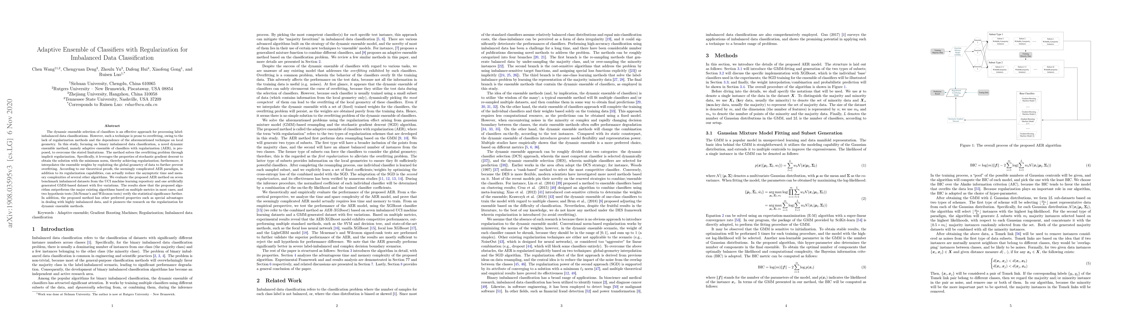 The paper proposes an adaptive ensemble of classifiers with regularization (AER) to address overfitting in dynamic ensemble selection for imbalanced data classification. The AER method implicitly regularizes through stochastic gradient descent and interpolates ensemble weights based on global data geometry, achieving better performance and lower complexity compared to existing algorithms.