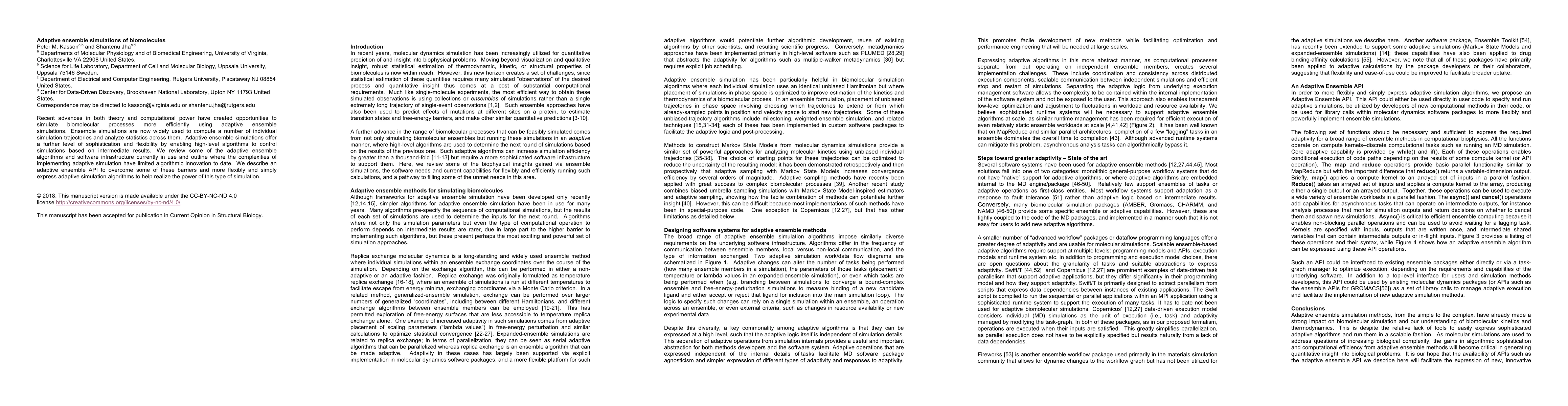 Recent advances in both theory and computational power have created opportunities to simulate biomolecular processes more efficiently using adaptive ensemble simulations. Ensemble simulations are now widely used to compute a number of individual simulation trajectories and analyze statistics across them. Adaptive ensemble simulations offer a further level of sophistication and flexibility by enabling high-level algorithms to control simulations based on intermediate results. We review some of the adaptive ensemble algorithms and software infrastructure currently in use and outline where the complexities of implementing adaptive simulation have limited algorithmic innovation to date. We describe an adaptive ensemble API to overcome some of these barriers and more flexibly and simply express adaptive simulation algorithms to help realize the power of this type of simulation.