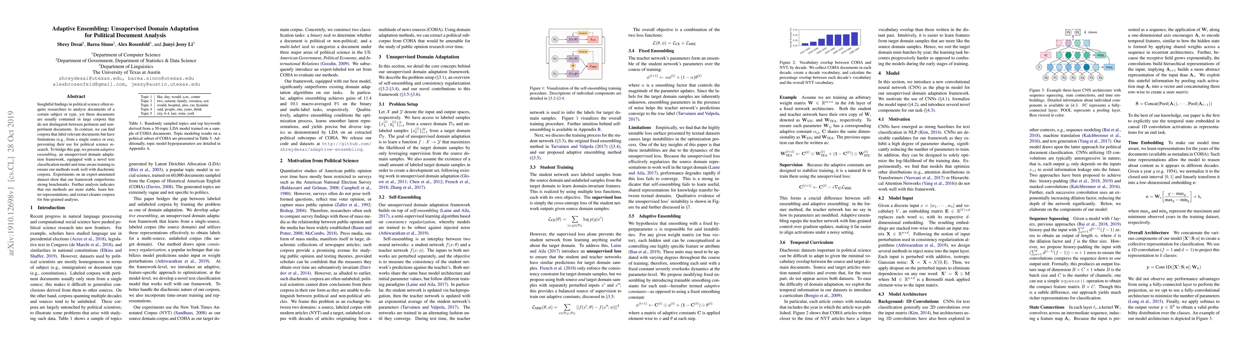 Insightful findings in political science often require researchers to analyze documents of a certain subject or type, yet these documents are usually contained in large corpora that do not distinguish between pertinent and non-pertinent documents. In contrast, we can find corpora that label relevant documents but have limitations (e.g., from a single source or era), preventing their use for political science research. To bridge this gap, we present \textit{adaptive ensembling}, an unsupervised domain adaptation framework, equipped with a novel text classification model and time-aware training to ensure our methods work well with diachronic corpora. Experiments on an expert-annotated dataset show that our framework outperforms strong benchmarks. Further analysis indicates that our methods are more stable, learn better representations, and extract cleaner corpora for fine-grained analysis.