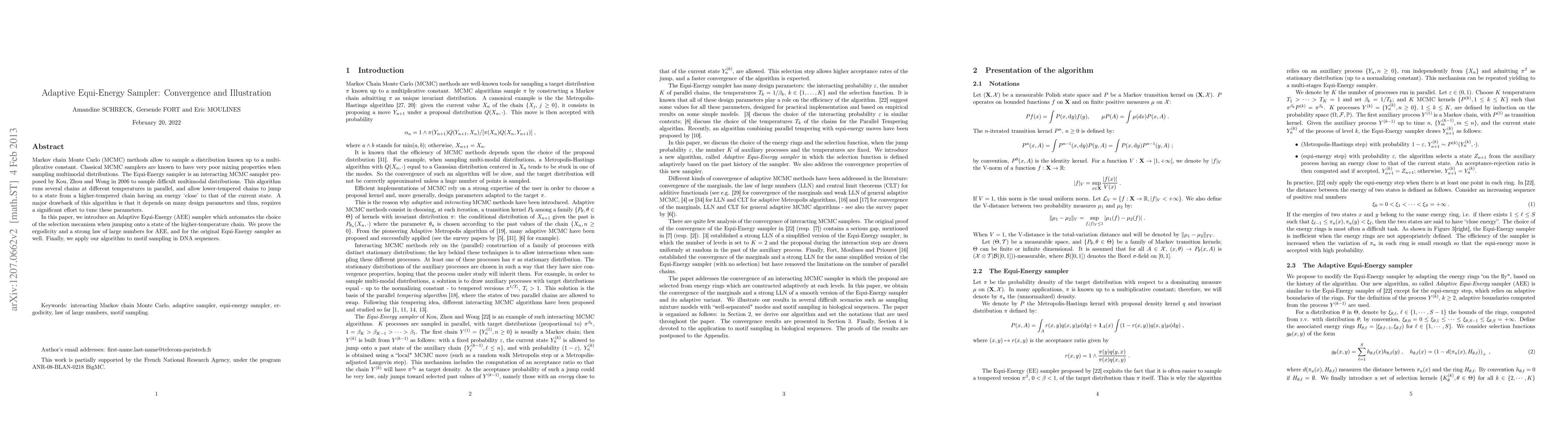 This paper introduces an Adaptive Equi-Energy (AEE) sampler to improve the Equi-Energy sampler's performance in sampling multimodal distributions by automating parameter selection. The authors prove the ergodicity and strong law of large numbers for both the AEE and original samplers, and demonstrate its application in motif sampling in DNA sequences.