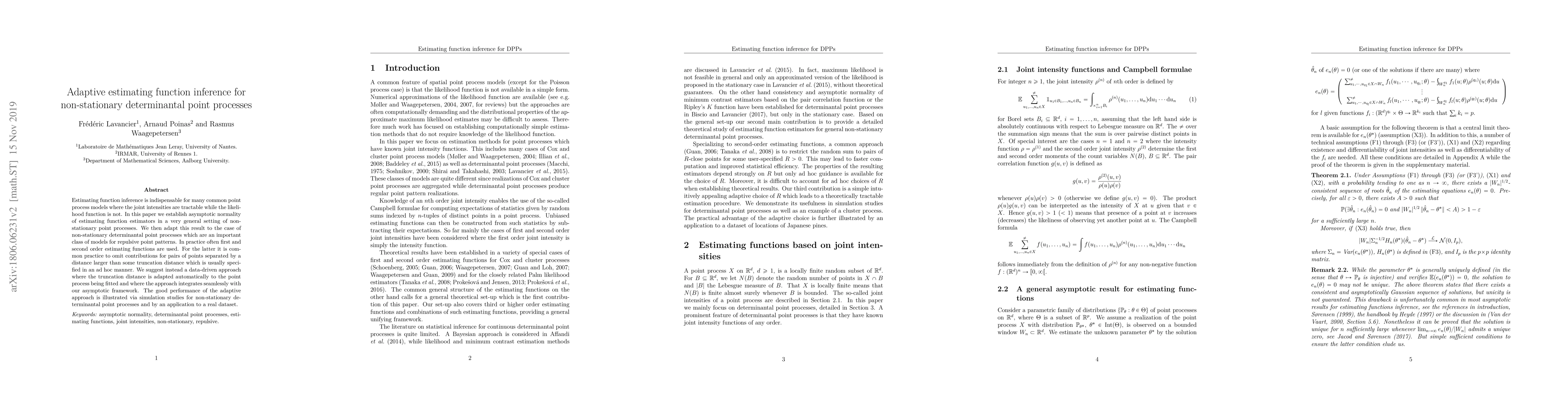 This paper establishes the asymptotic normality of estimating function estimators for non-stationary point processes and extends this to adaptive methods for non-stationary determinantal point processes. It proposes a data-driven method to determine the truncation distance, enhancing performance as demonstrated through simulations and a real-world application.
