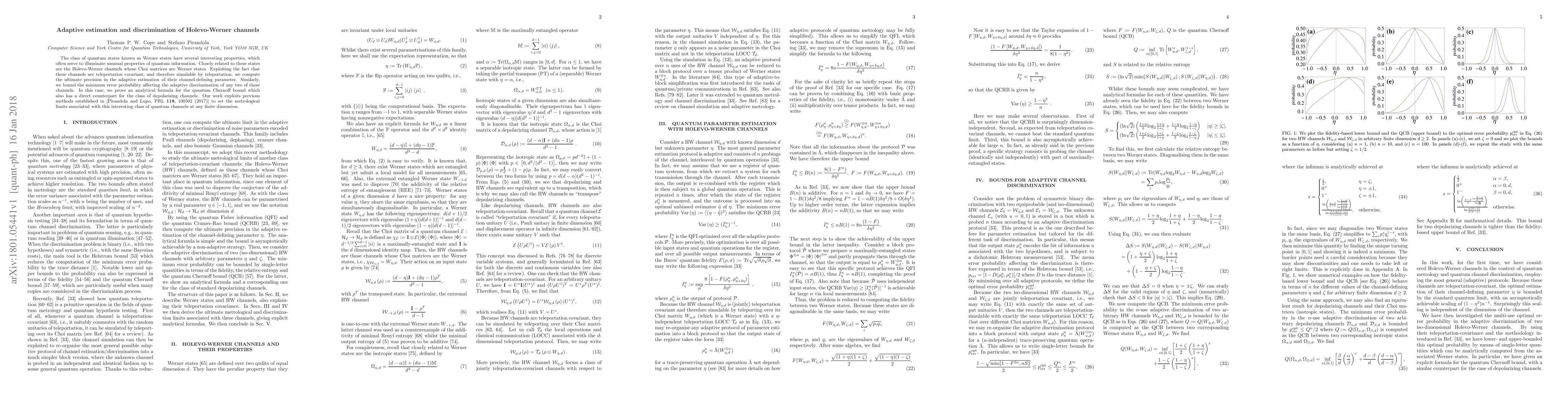 This paper investigates the adaptive estimation and discrimination of Holevo-Werner channels, leveraging their teleportation covariance to compute precision limits and minimum error probabilities. It establishes an analytical formula for the quantum Chernoff bound and extends previous methods to set metrological limits for these channels.