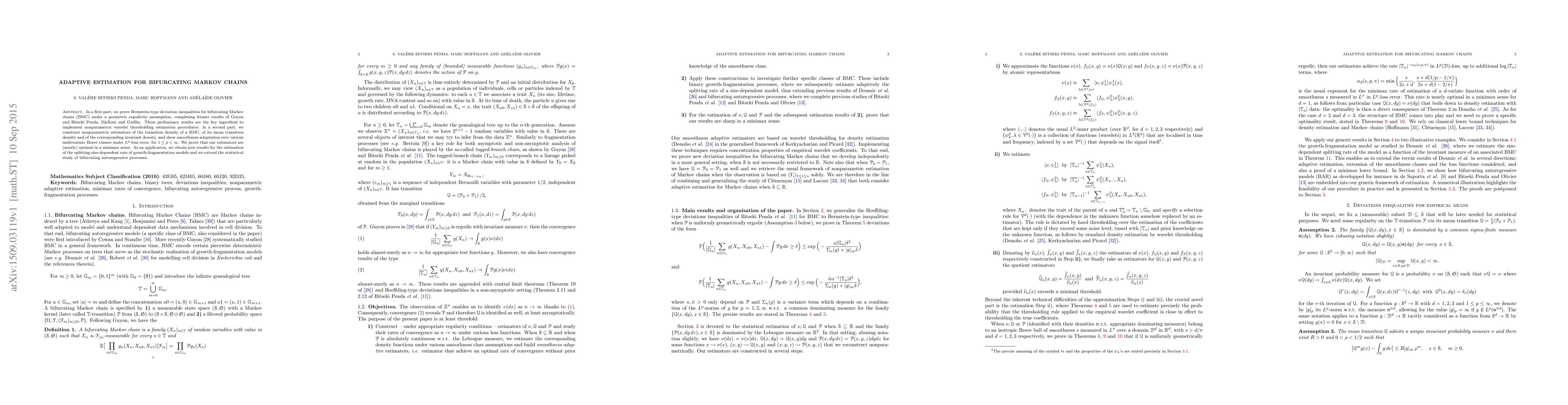 This paper proves Bernstein-type deviation inequalities for bifurcating Markov chains under geometric ergodicity, enabling the construction of nonparametric wavelet thresholding estimators for transition densities. The proposed estimators demonstrate optimal smoothness adaptation and are nearly minimax optimal.