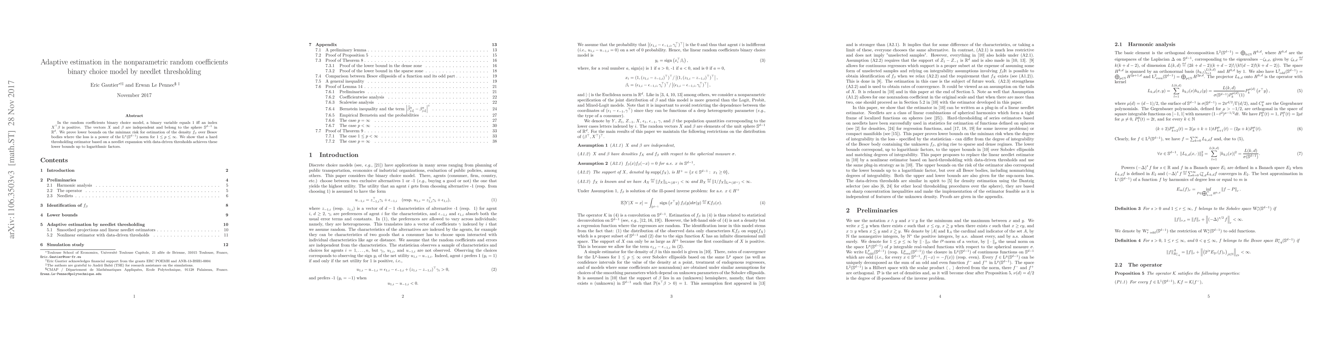 In the random coefficients binary choice model, a binary variable equals 1 iff an index $X^\top\beta$ is positive.The vectors $X$ and $\beta$ are independent and belong to the sphere $\mathbb{S}^{d-1}$ in $\mathbb{R}^{d}$.We prove lower bounds on the minimax risk for estimation of the density $f\_{\beta}$ over Besov bodies where the loss is a power of the $L^p(\mathbb{S}^{d-1})$ norm for $1\le p\le \infty$. We show that a hard thresholding estimator based on a needlet expansion with data-driven thresholds achieves these lower bounds up to logarithmic factors.