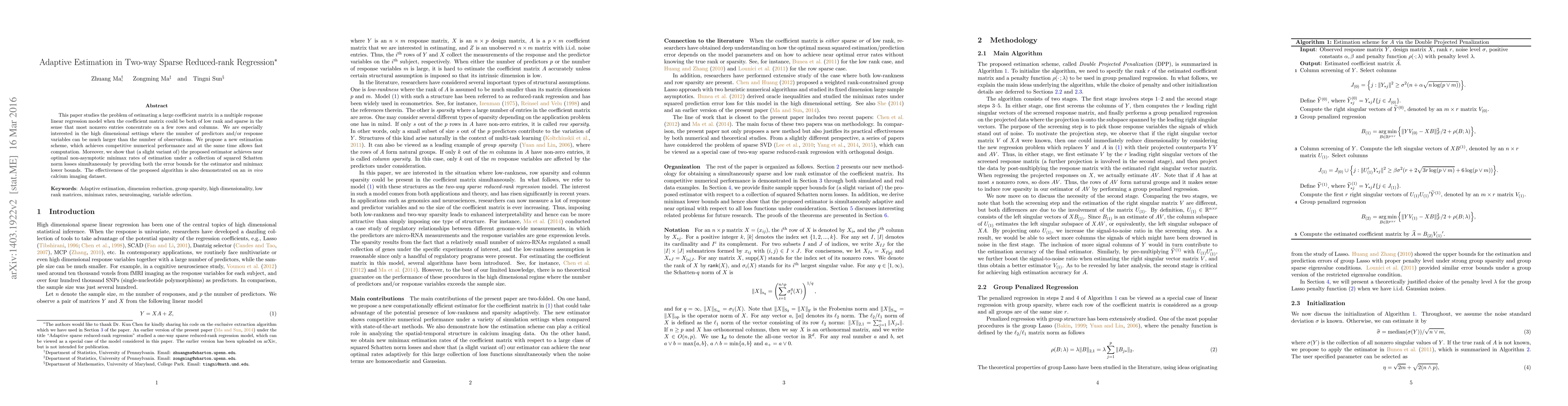 This paper proposes an adaptive estimation scheme for two-way sparse reduced-rank regression in high-dimensional settings, achieving competitive performance and fast computation. The proposed estimator achieves near optimal non-asymptotic minimax rates and is validated using an \textit{in vivo} calcium imaging dataset.