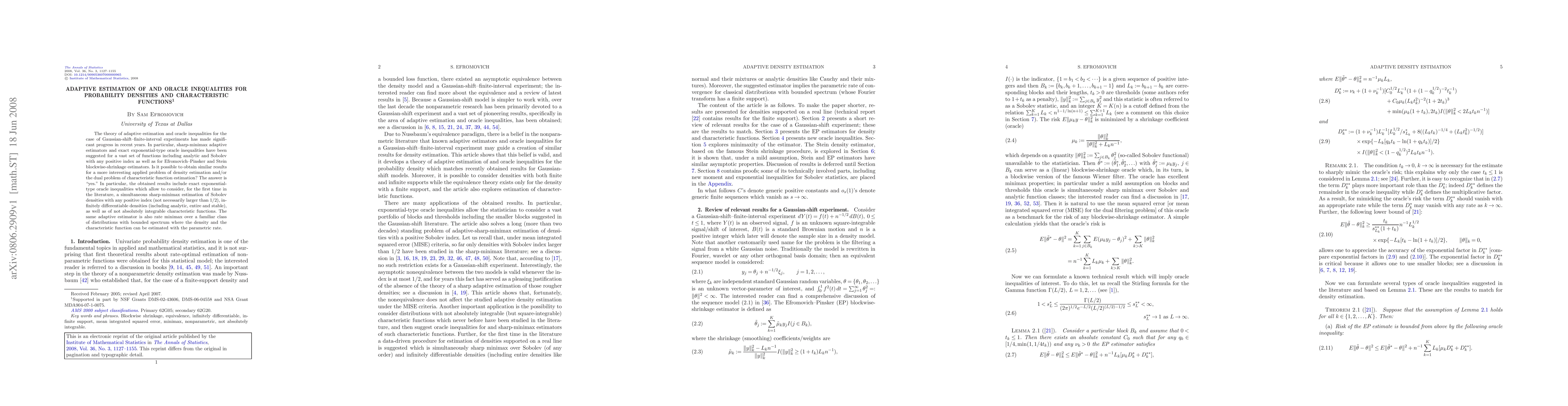 The theory of adaptive estimation and oracle inequalities for the case of Gaussian-shift--finite-interval experiments has made significant progress in recent years. In particular, sharp-minimax adaptive estimators and exact exponential-type oracle inequalities have been suggested for a vast set of functions including analytic and Sobolev with any positive index as well as for Efromovich--Pinsker and Stein blockwise-shrinkage estimators. Is it possible to obtain similar results for a more interesting applied problem of density estimation and/or the dual problem of characteristic function estimation? The answer is ``yes.'' In particular, the obtained results include exact exponential-type oracle inequalities which allow to consider, for the first time in the literature, a simultaneous sharp-minimax estimation of Sobolev densities with any positive index (not necessarily larger than 1/2), infinitely differentiable densities (including analytic, entire and stable), as well as of not absolutely integrable characteristic functions. The same adaptive estimator is also rate minimax over a familiar class of distributions with bounded spectrum where the density and the characteristic function can be estimated with the parametric rate.