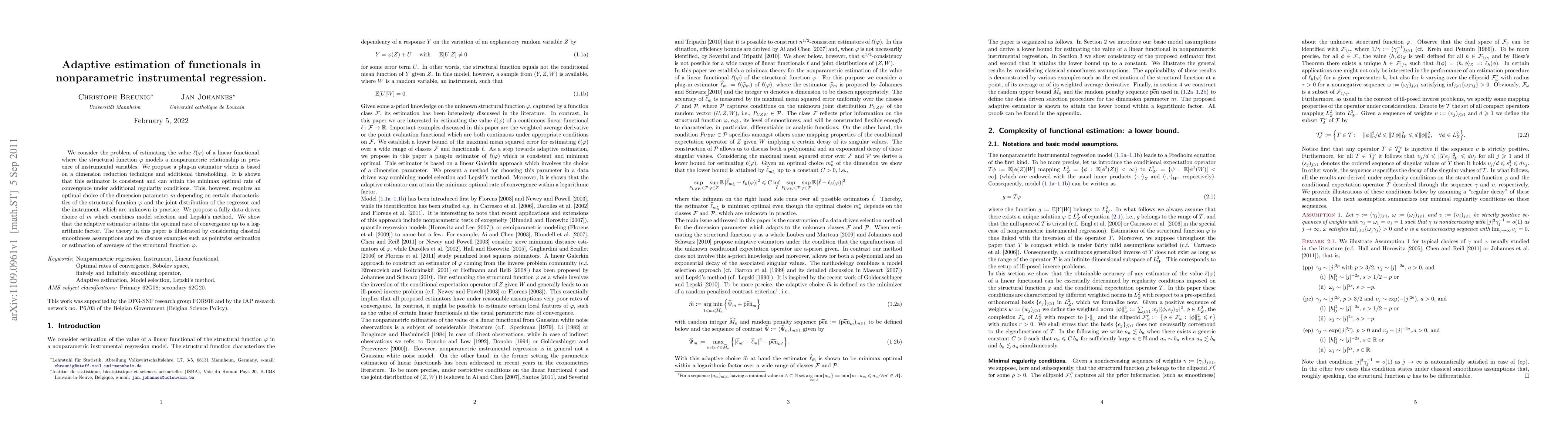 This paper proposes an adaptive estimator for a linear functional in nonparametric instrumental regression, achieving minimax optimal convergence rates through a data-driven choice of dimension parameter. The method combines dimension reduction, thresholding, model selection, and Lepski's method to ensure consistency and optimal performance.