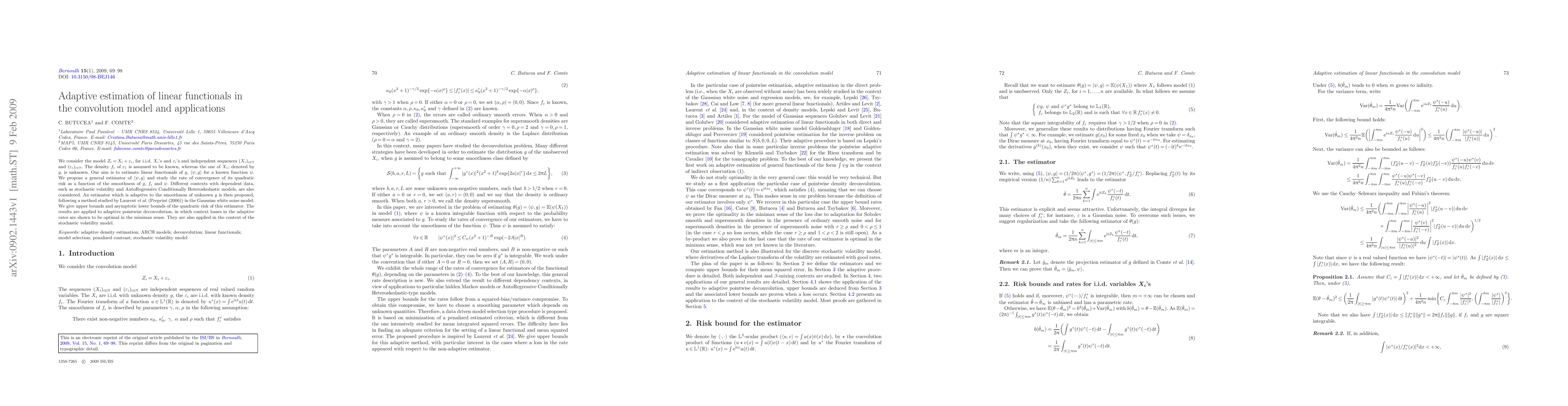 We consider the model $Z_i=X_i+\varepsilon_i$, for i.i.d. $X_i$'s and $\varepsilon_i$'s and independent sequences $(X_i)_{i\in{\mathbb{N}}}$ and $(\varepsilon_i)_{i\in{\mathbb{N}}}$. The density $f_{\varepsilon}$ of $\varepsilon_1$ is assumed to be known, whereas the one of $X_1$, denoted by $g$, is unknown. Our aim is to estimate linear functionals of $g$, $<\psi,g>$ for a known function $\psi$. We propose a general estimator of $<\psi,g>$ and study the rate of convergence of its quadratic risk as a function of the smoothness of $g$, $f_{\varepsilon}$ and $\psi$. Different contexts with dependent data, such as stochastic volatility and AutoRegressive Conditionally Heteroskedastic models, are also considered. An estimator which is adaptive to the smoothness of unknown $g$ is then proposed, following a method studied by Laurent et al. (Preprint (2006)) in the Gaussian white noise model. We give upper bounds and asymptotic lower bounds of the quadratic risk of this estimator. The results are applied to adaptive pointwise deconvolution, in which context losses in the adaptive rates are shown to be optimal in the minimax sense. They are also applied in the context of the stochastic volatility model.