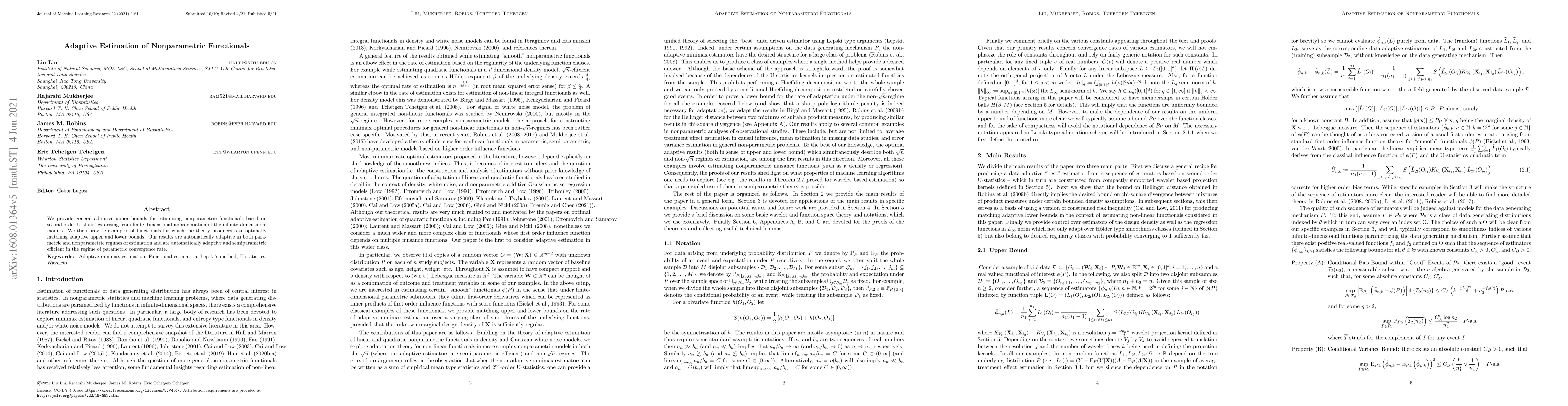 This paper develops adaptive upper bounds for estimating nonparametric functionals using second-order U-statistics, providing rate-optimal examples and demonstrating automatic adaptability in both parametric and nonparametric settings, as well as semiparametric efficiency in parametric convergence scenarios.