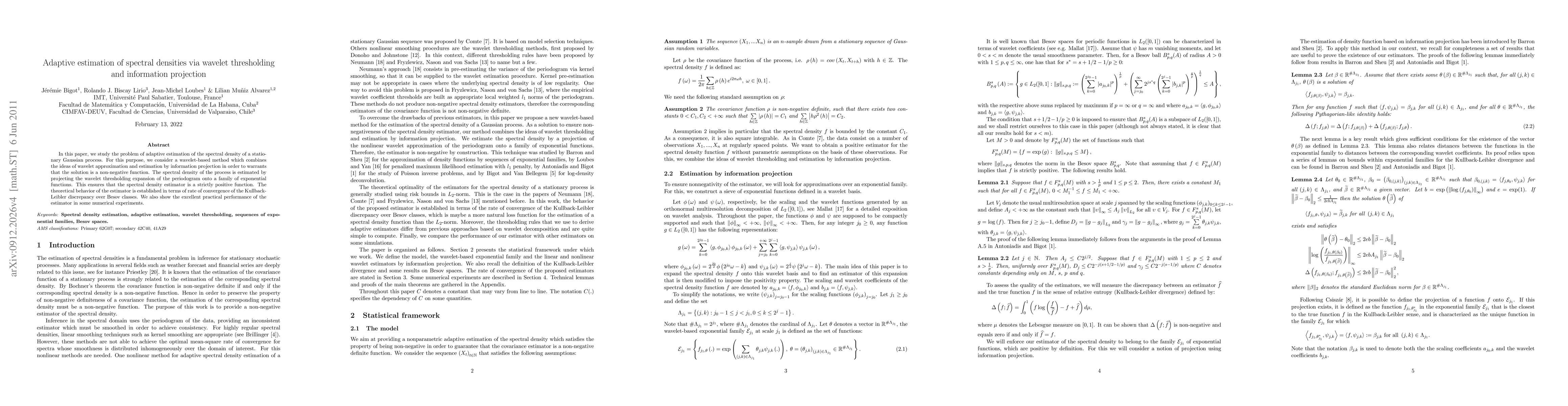 This paper proposes a wavelet-based method for adaptive estimation of the spectral density of a stationary Gaussian process, combining wavelet thresholding and information projection to ensure a nonnegative estimator. The method projects the wavelet thresholding expansion of the periodogram onto exponential functions, ensuring a strictly positive spectral density estimator and positive semidefinite covariance function estimator, with theoretical convergence rates established and practical performance validated through numerical experiments.