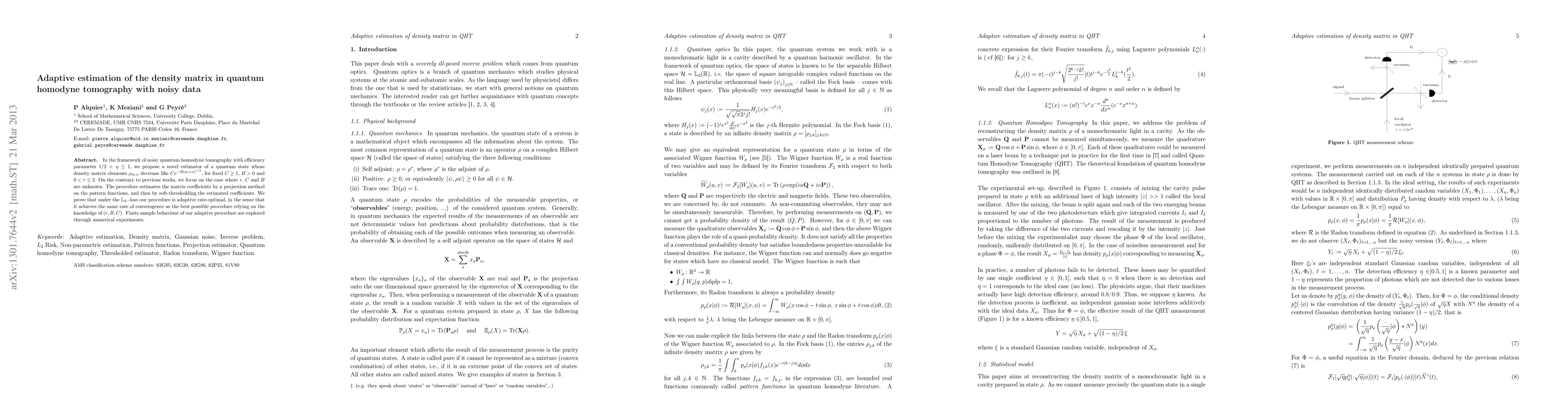 This paper proposes a novel adaptive estimator for quantum homodyne tomography under noisy conditions, focusing on unknown parameters. The method uses projection and soft-thresholding to estimate density matrix elements, achieving optimal convergence rates without prior knowledge of the parameters. Numerical experiments validate the finite sample performance of the proposed procedure.