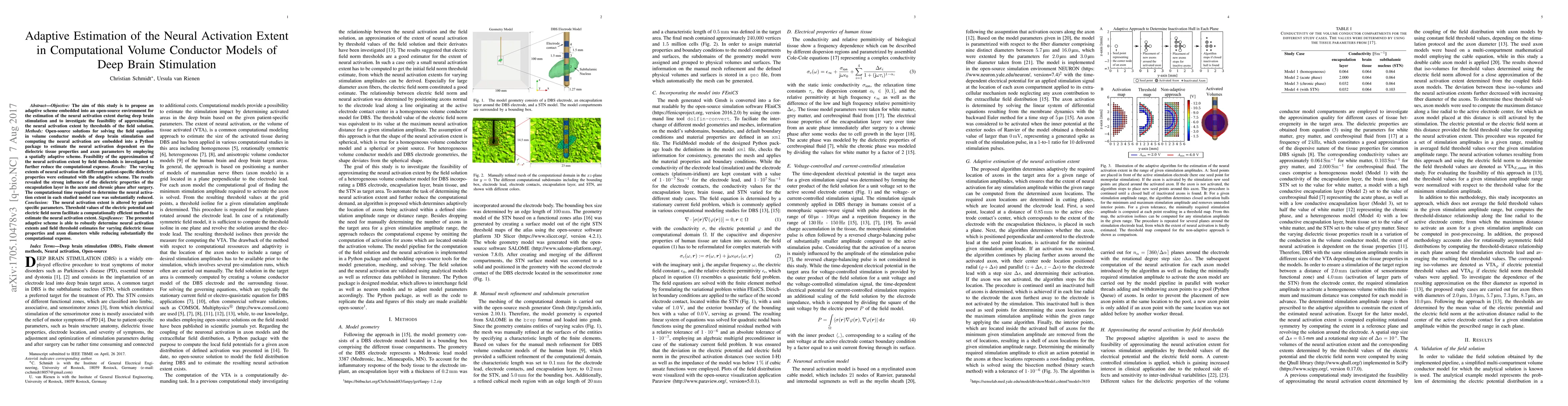 Objective: The aim of this study is to propose an adaptive scheme embedded into an open-source environment for the estimation of the neural activation extent during deep brain stimulation and to investigate the feasibility of approximating the neural activation extent by thresholds of the field solution. Methods: Open-source solutions for solving the field equation in volume conductor models of deep brain stimulation and computing the neural activation are embedded into a Python package to estimate the neural activation dependent on the dielectric tissue properties and axon parameters by employing a spatially adaptive scheme. Feasibility of the approximation of the neural activation extent by field thresholds is investigated to further reduce the computational expense. Results: The varying extents of neural activation for different patient-specific dielectric properties were estimated with the adaptive scheme. The results revealed the strong influence of the dielectric properties of the encapsulation layer in the acute and chronic phase after surgery. The computational time required to determine the neural activation extent in each studied model case was substantially reduced. Conclusion: The neural activation extent is altered by patient-specific parameters. Threshold values of the electric potential and electric field norm facilitate a computationally efficient method to estimate the neural activation extent. Significance: The presented adaptive scheme is able to robustly determine neural activation extents and field threshold estimates for varying dielectric tissue properties and axon diameters while reducing substantially the computational expense.