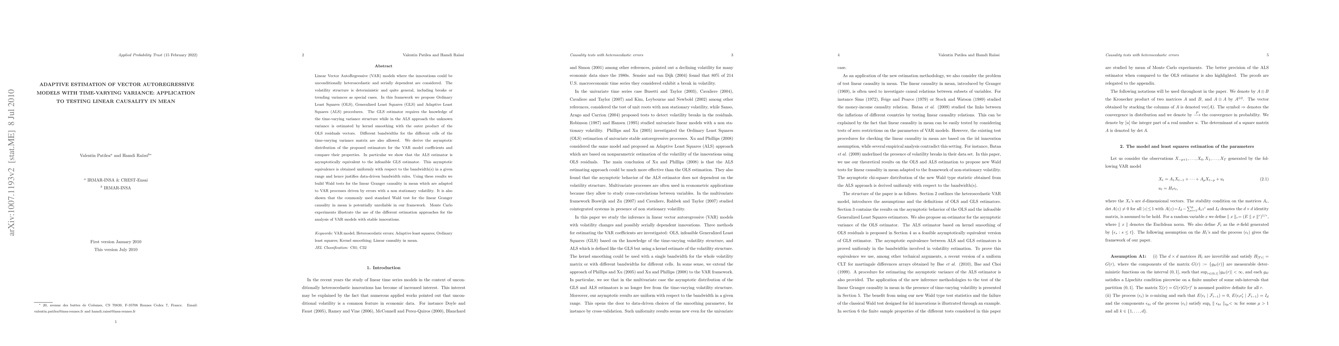 This paper proposes Ordinary, Generalized, and Adaptive Least Squares procedures for estimating Vector AutoRegressive models with time-varying variances. The Adaptive Least Squares estimator, which uses kernel smoothing of OLS residuals, is shown to be asymptotically equivalent to the Generalized Least Squares estimator, justifying data-driven bandwidth rules. The study also develops adapted Wald tests for linear Granger causality in mean, highlighting the unreliability of standard tests in this context.