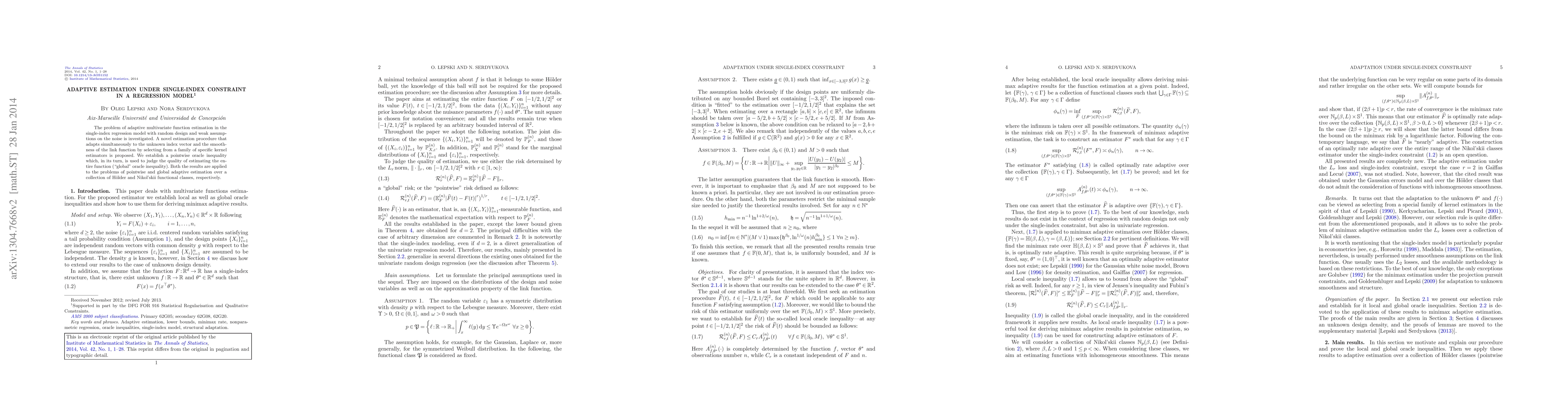This research introduces an adaptive estimation method for single-index regression models under random design and weak noise assumptions. It proposes a novel procedure that simultaneously adapts to unknown index vectors and link function smoothness by selecting from a set of kernel estimators. The method's performance is supported by pointwise and global oracle inequalities, applicable to Hölder and Nikol'skii functional classes.