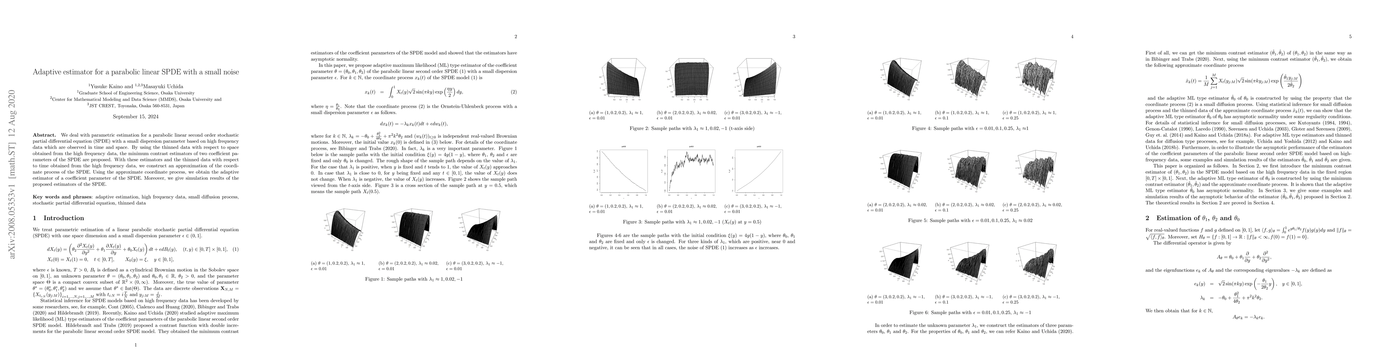 We deal with parametric estimation for a parabolic linear second order stochastic partial differential equation (SPDE) with a small dispersion parameter based on high frequency data which are observed in time and space. By using the thinned data with respect to space obtained from the high frequency data, the minimum contrast estimators of two coefficient parameters of the SPDE are proposed. With these estimators and the thinned data with respect to time obtained from the high frequency data, we construct an approximation of the coordinate process of the SPDE. Using the approximate coordinate process, we obtain the adaptive estimator of a coefficient parameter of the SPDE. Moreover, we give simulation results of the proposed estimators of the SPDE.