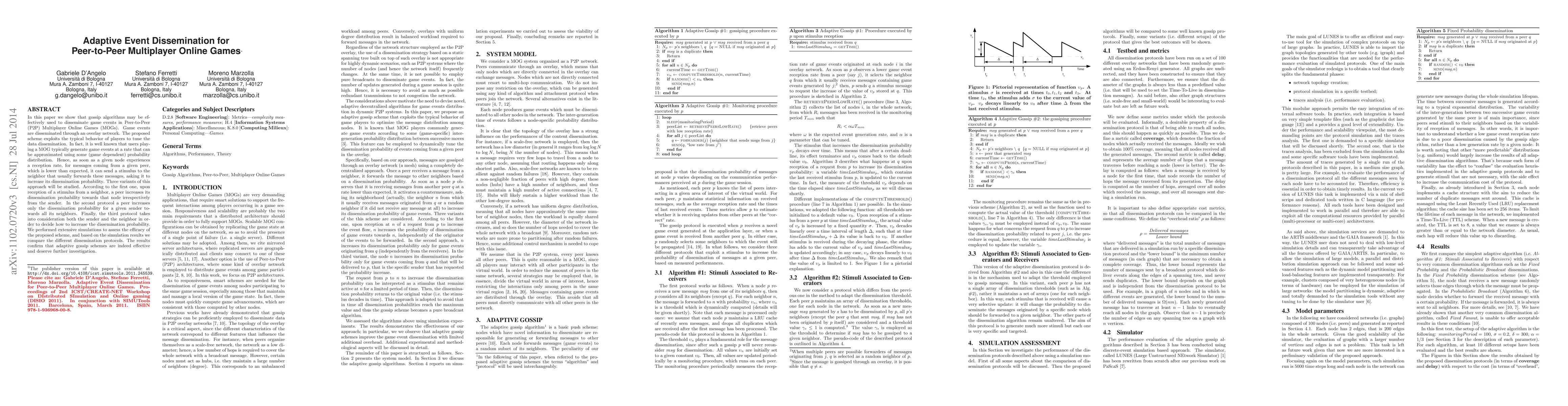 This paper proposes adaptive gossip algorithms to disseminate game events in P2P Multiplayer Online Games, leveraging player behavior to optimize data dissemination. Three dissemination protocols were studied and simulations confirmed the effectiveness of adaptive gossip schemes for event dissemination in P2P MOGs.