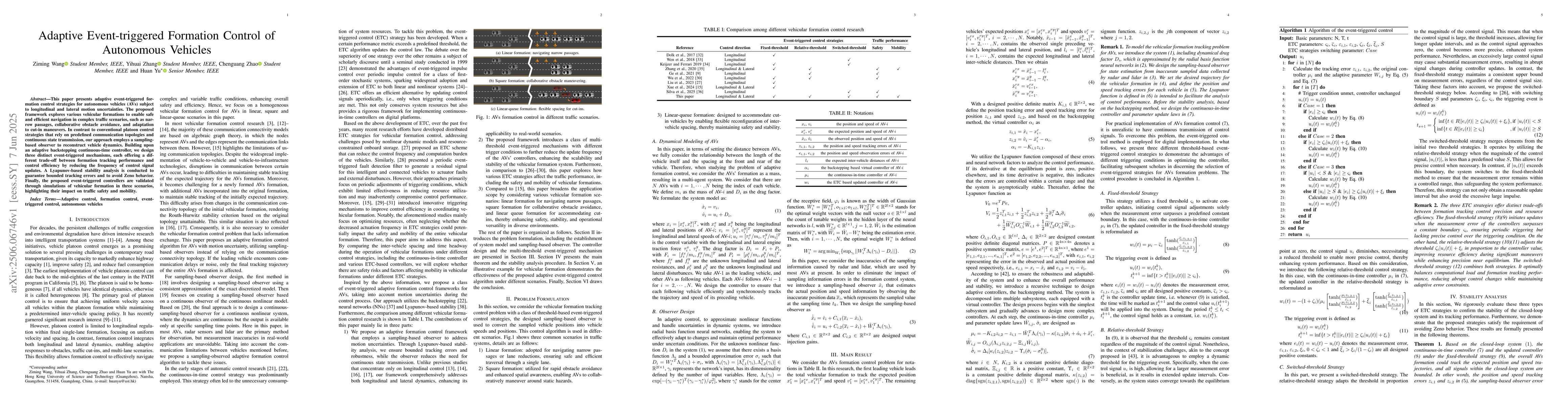 This paper proposes adaptive event-triggered formation control for autonomous vehicles to navigate complex traffic scenarios while ensuring safety and efficiency. It presents a sampling-based observer approach with three distinct mechanisms offering trade-offs between performance and control efficiency.
