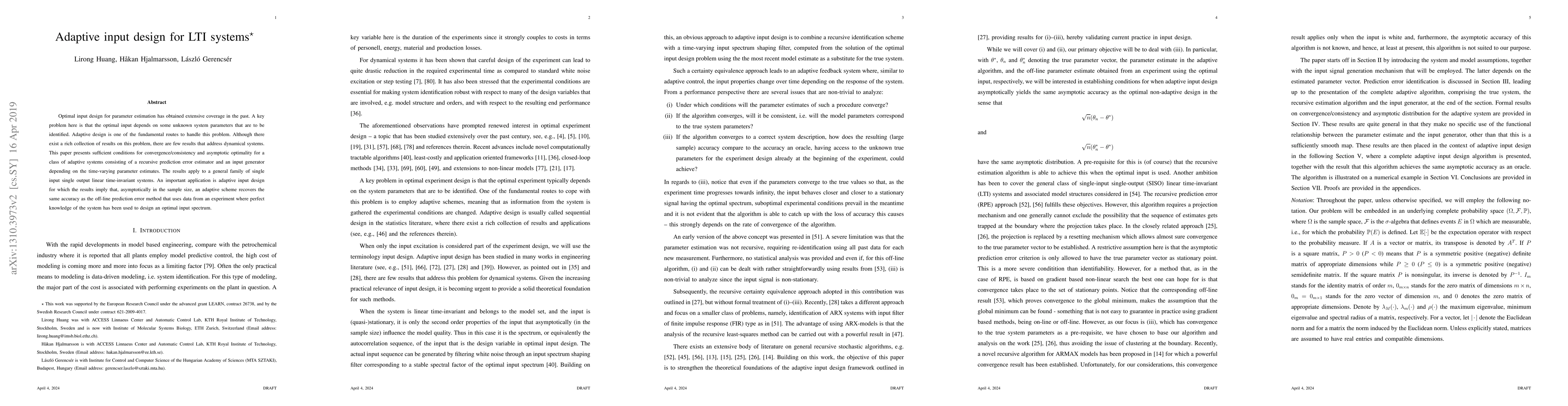This paper introduces an adaptive input design method for parameter estimation in linear-time-invariant (LTI) systems, addressing the challenge of optimal input selection when system parameters are unknown. The proposed method aims to dynamically adjust the input design to improve parameter identification.