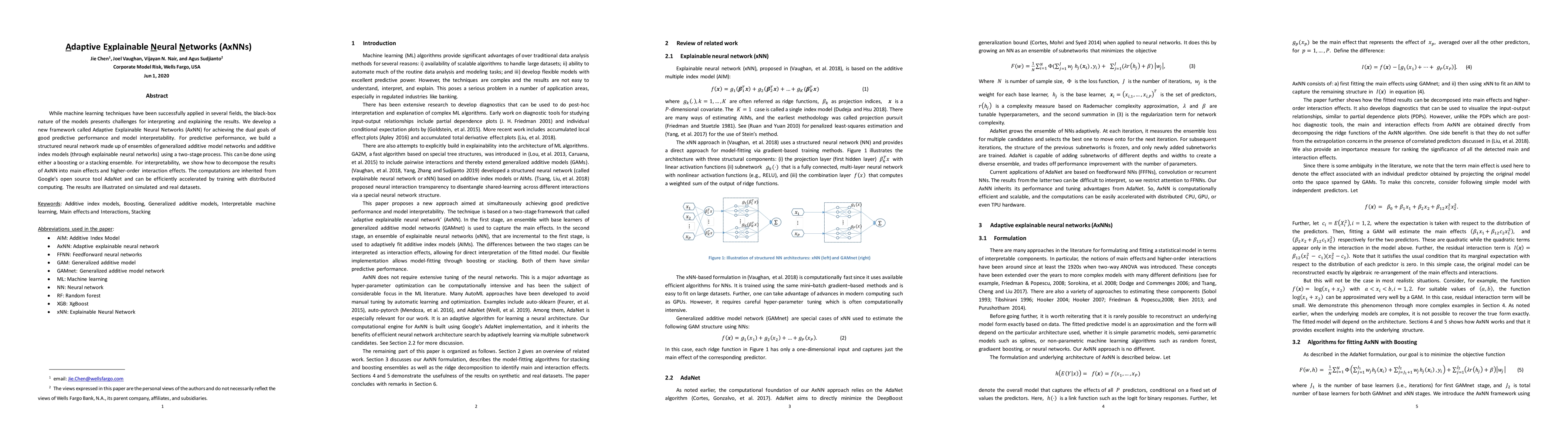 While machine learning techniques have been successfully applied in several fields, the black-box nature of the models presents challenges for interpreting and explaining the results. We develop a new framework called Adaptive Explainable Neural Networks (AxNN) for achieving the dual goals of good predictive performance and model interpretability. For predictive performance, we build a structured neural network made up of ensembles of generalized additive model networks and additive index models (through explainable neural networks) using a two-stage process. This can be done using either a boosting or a stacking ensemble. For interpretability, we show how to decompose the results of AxNN into main effects and higher-order interaction effects. The computations are inherited from Google's open source tool AdaNet and can be efficiently accelerated by training with distributed computing. The results are illustrated on simulated and real datasets.