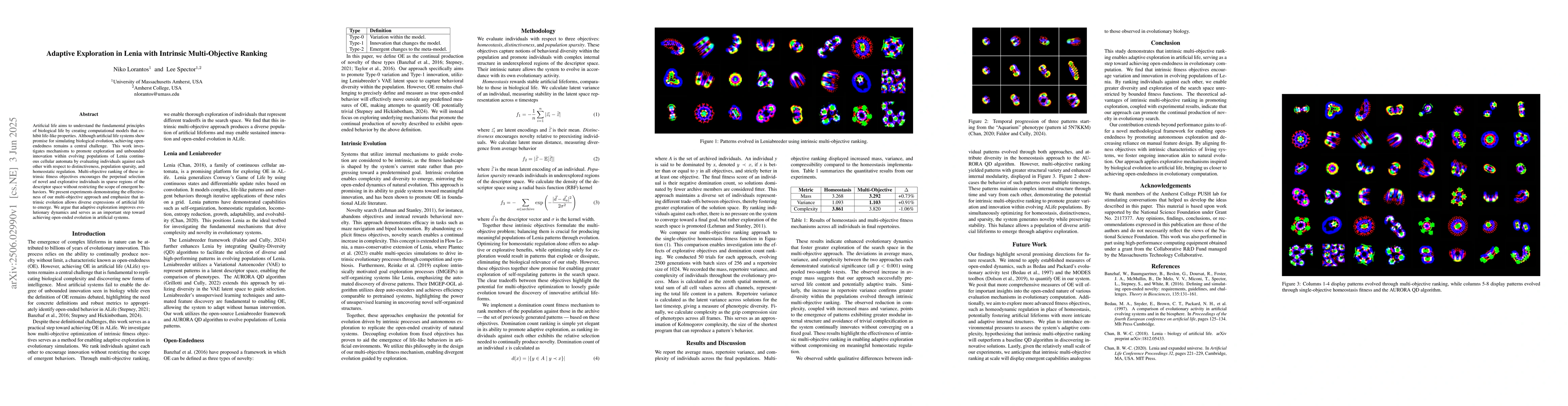 Artificial life aims to understand the fundamental principles of biological life by creating computational models that exhibit life-like properties. Although artificial life systems show promise for simulating biological evolution, achieving open-endedness remains a central challenge. This work investigates mechanisms to promote exploration and unbounded innovation within evolving populations of Lenia continuous cellular automata by evaluating individuals against each other with respect to distinctiveness, population sparsity, and homeostatic regulation. Multi-objective ranking of these intrinsic fitness objectives encourages the perpetual selection of novel and explorative individuals in sparse regions of the descriptor space without restricting the scope of emergent behaviors. We present experiments demonstrating the effectiveness of our multi-objective approach and emphasize that intrinsic evolution allows diverse expressions of artificial life to emerge. We argue that adaptive exploration improves evolutionary dynamics and serves as an important step toward achieving open-ended evolution in artificial systems.