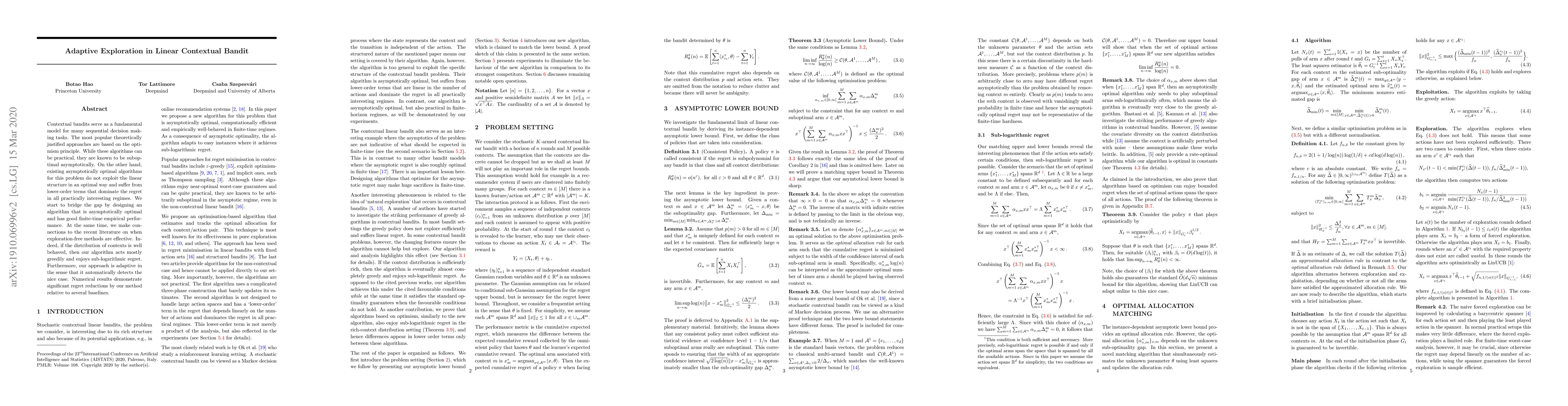 Contextual bandits serve as a fundamental model for many sequential decision making tasks. The most popular theoretically justified approaches are based on the optimism principle. While these algorithms can be practical, they are known to be suboptimal asymptotically. On the other hand, existing asymptotically optimal algorithms for this problem do not exploit the linear structure in an optimal way and suffer from lower-order terms that dominate the regret in all practically interesting regimes. We start to bridge the gap by designing an algorithm that is asymptotically optimal and has good finite-time empirical performance. At the same time, we make connections to the recent literature on when exploration-free methods are effective. Indeed, if the distribution of contexts is well behaved, then our algorithm acts mostly greedily and enjoys sub-logarithmic regret. Furthermore, our approach is adaptive in the sense that it automatically detects the nice case. Numerical results demonstrate significant regret reductions by our method relative to several baselines.