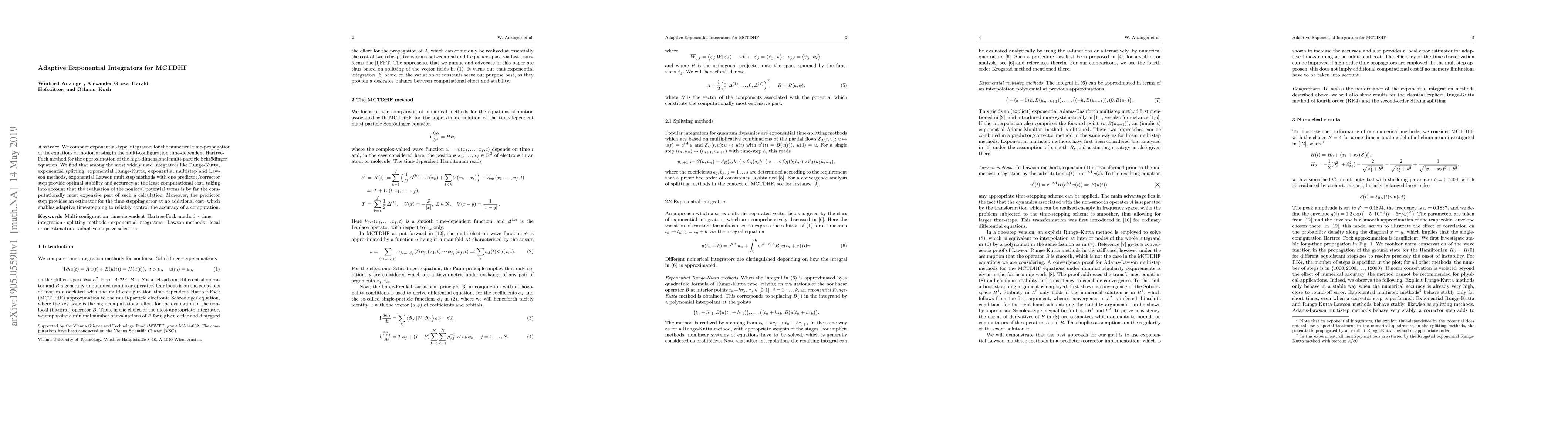 We compare exponential-type integrators for the numerical time-propagation of the equations of motion arising in the multi-configuration time-dependent Hartree-Fock method for the approximation of the high-dimensional multi-particle Schr{\"o}dinger equation. We find that among the most widely used integrators like Runge-Kutta, exponential splitting, exponential Runge-Kutta, exponential multistep and Lawson methods, exponential Lawson multistep methods with one predictor/corrector step provide optimal stability and accuracy at the least computational cost, taking into account that the evaluation of the nonlocal potential terms is by far the computationally most expensive part of such a calculation. Moreover, the predictor step provides an estimator for the time-stepping error at no additional cost, which enables adaptive time-stepping to reliably control the accuracy of a computation.