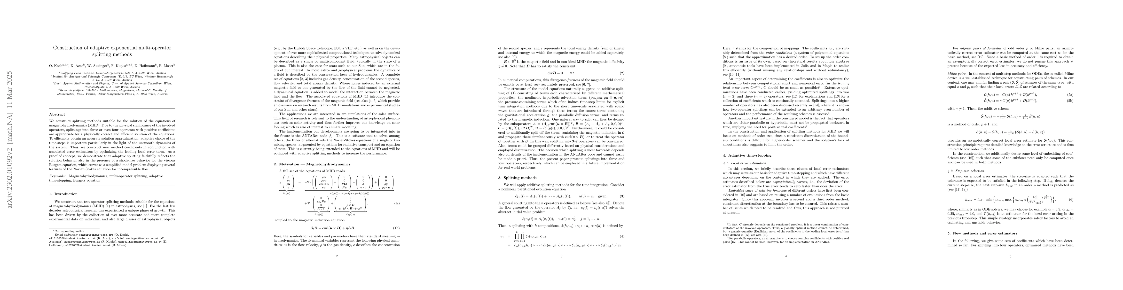 This paper develops adaptive exponential multi-operator splitting methods for solving magnetohydrodynamics (MHD) equations, employing splitting into multiple operators to ensure physical accuracy and efficiency. The adaptive time-step selection optimizes error estimators to achieve accurate solution approximations, validated through a shock-containing viscous Burgers equation model.