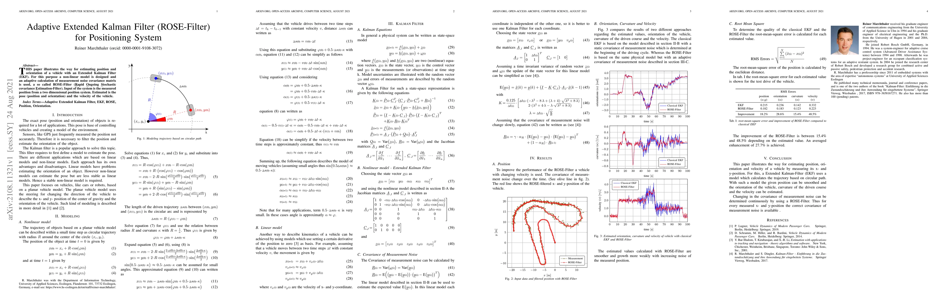 This paper illustrates the way for estimating position and orientation of a vehicle with an Extended Kalman Filter (EKF). For this purpose a non-linear model is designed and an adaptive calculation of measurement noise covariance matrix is used, a so called ROSE-Filter (Rapid Ongoing Stochastic covariance Estimation-Filter). Input of the system is the measured position from a two dimensional position system. Estimated is the pose (position and orientation) and the velocity of the vehicle.