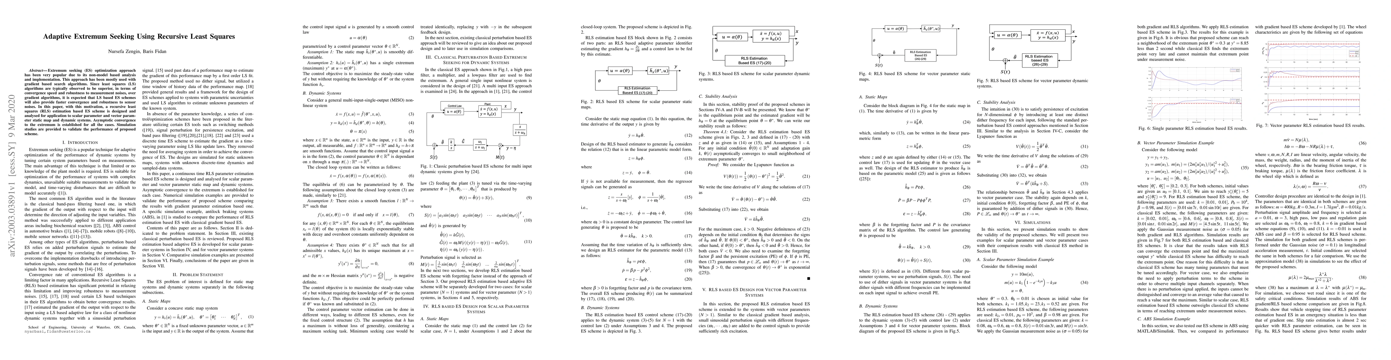 Extremum seeking (ES) optimization approach has been very popular due to its non-model based analysis and implementation. This approach has been mostly used with gradient based search algorithms. Since least squares (LS) algorithms are typically observed to be superior, in terms of convergence speed and robustness to measurement noises, over gradient algorithms, it is expected that LS based ES schemes will also provide faster convergence and robustness to sensor noises. In this paper, with this motivation, a recursive least squares (RLS) estimation based ES scheme is designed and analysed for application to scalar parameter and vector parameter static map and dynamic systems. Asymptotic convergence to the extremum is established for all the cases. Simulation studies are provided to validate the performance of proposed scheme.