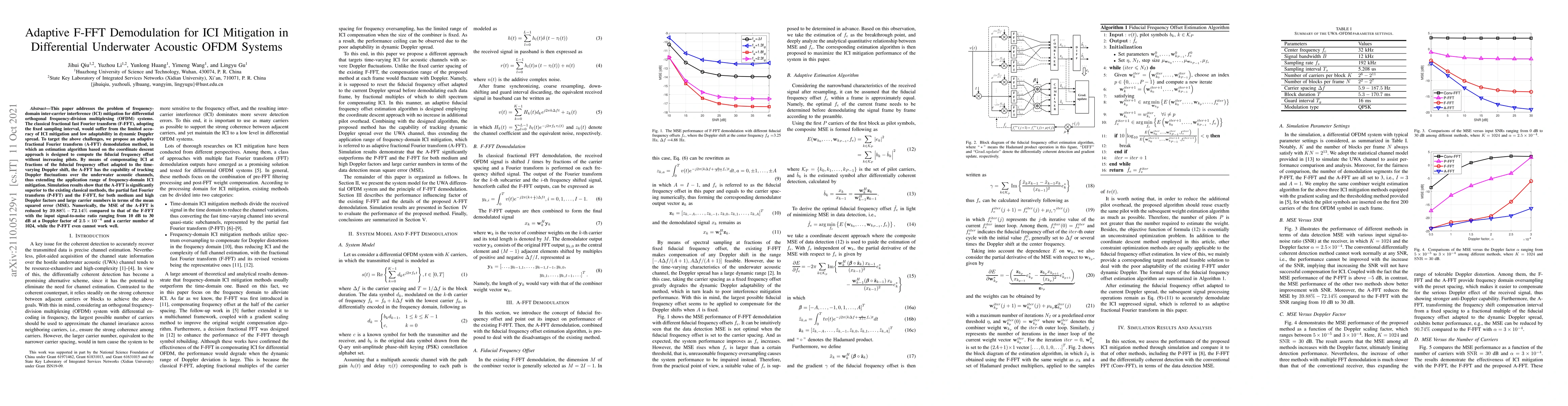 This paper proposes an adaptive fractional Fourier transform (A-FFT) demodulation method for mitigating inter-carrier interference (ICI) in differential underwater acoustic OFDM systems, significantly outperforming classical F-FFT and P-FFT in terms of mean squared error (MSE) under varying Doppler conditions.