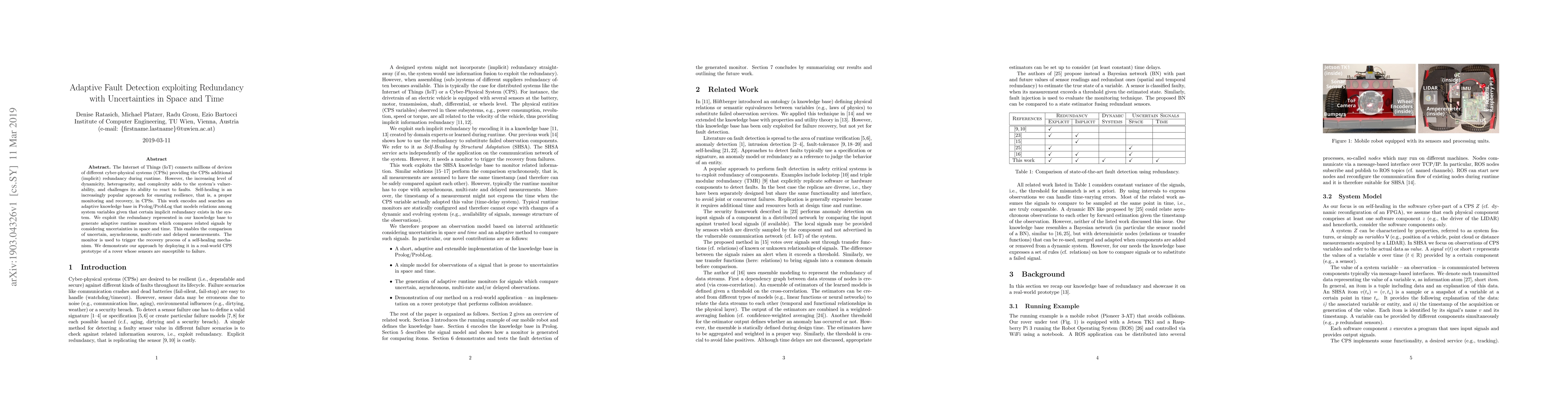 The Internet of Things (IoT) connects millions of devices of different cyber-physical systems (CPSs) providing the CPSs additional (implicit) redundancy during runtime. However, the increasing level of dynamicity, heterogeneity, and complexity adds to the system's vulnerability, and challenges its ability to react to faults. Self-healing is an increasingly popular approach for ensuring resilience, that is, a proper monitoring and recovery, in CPSs. This work encodes and searches an adaptive knowledge base in Prolog/ProbLog that models relations among system variables given that certain implicit redundancy exists in the system. We exploit the redundancy represented in our knowledge base to generate adaptive runtime monitors which compares related signals by considering uncertainties in space and time. This enables the comparison of uncertain, asynchronous, multi-rate and delayed measurements. The monitor is used to trigger the recovery process of a self-healing mechanism. We demonstrate our approach by deploying it in a real-world CPS prototype of a rover whose sensors are susceptible to failure.