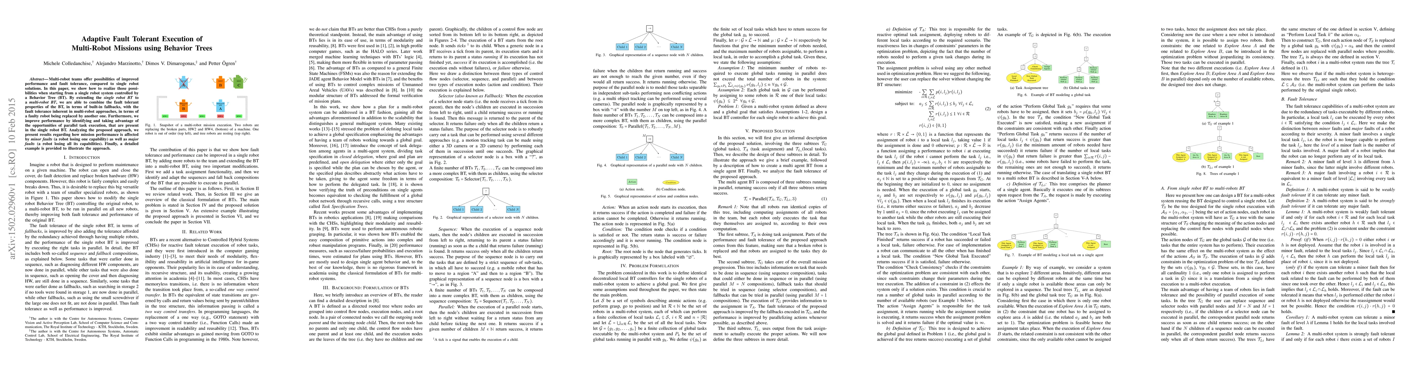 Multi-robot teams offer possibilities of improved performance and fault tolerance, compared to single robot solutions. In this paper, we show how to realize those possibilities when starting from a single robot system controlled by a Behavior Tree (BT). By extending the single robot BT to a multi-robot BT, we are able to combine the fault tolerant properties of the BT, in terms of built-in fallbacks, with the fault tolerance inherent in multi-robot approaches, in terms of a faulty robot being replaced by another one. Furthermore, we improve performance by identifying and taking advantage of the opportunities of parallel task execution, that are present in the single robot BT. Analyzing the proposed approach, we present results regarding how mission performance is affected by minor faults (a robot losing one capability) as well as major faults (a robot losing all its capabilities). Finally, a detailed example is provided to illustrate the approach.