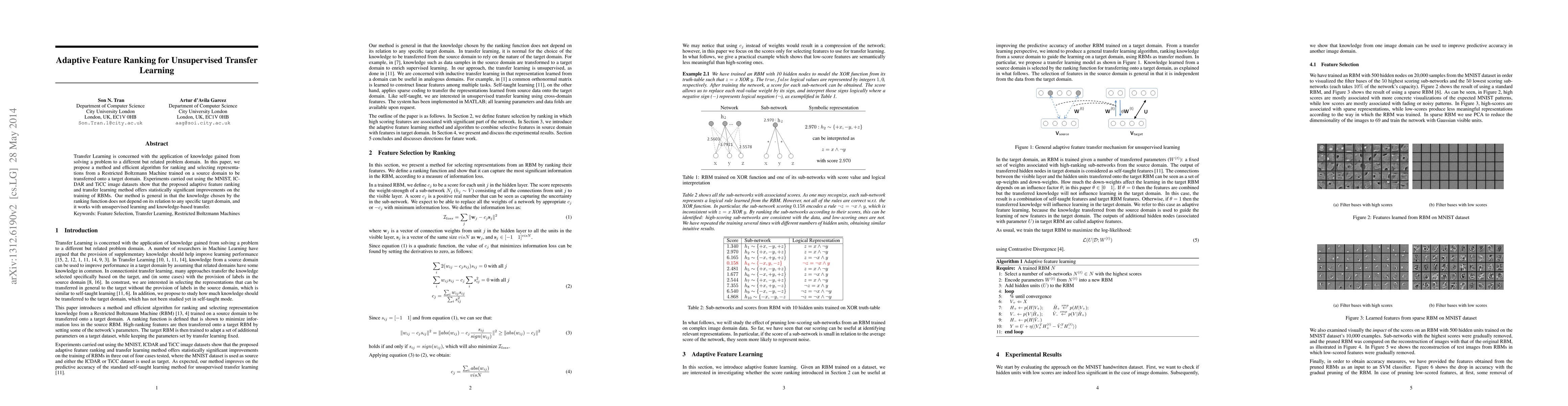 This paper proposes an adaptive feature ranking method for unsupervised transfer learning, specifically ranking representations from a Restricted Boltzmann Machine trained on a source domain to enhance its application to a target domain. The method demonstrates statistically significant improvements in RBM training across multiple datasets, showing general applicability and effectiveness in unsupervised learning scenarios.