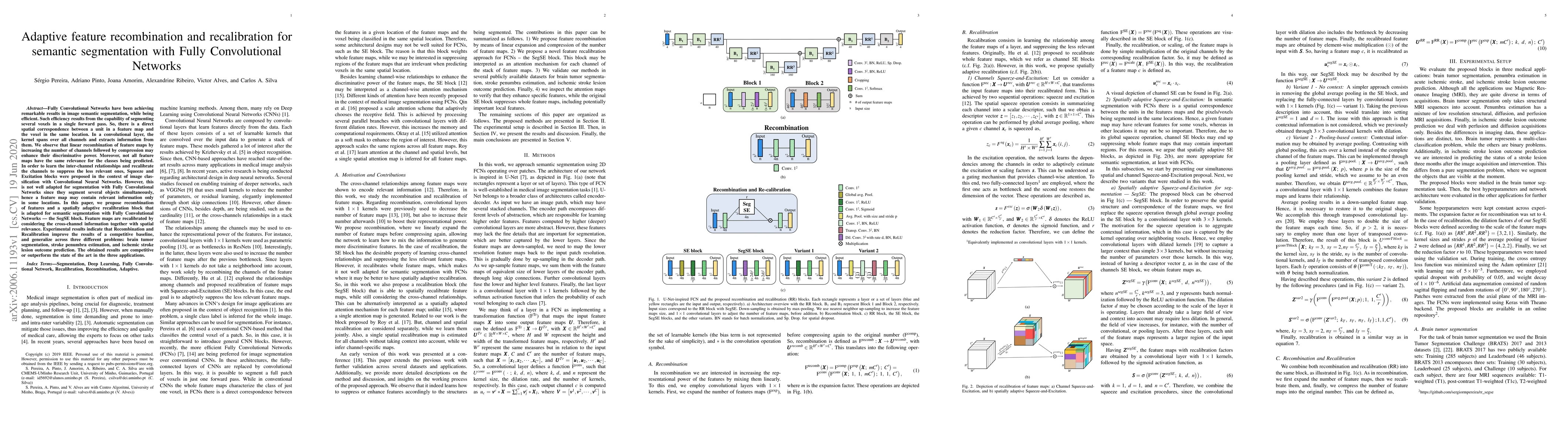 This paper proposes a SegSE block for Fully Convolutional Networks to enhance semantic segmentation by adaptively recombining and recalibrating feature maps, improving discriminative power and relevance. Experimental results show competitive or superior performance across brain tumor segmentation, stroke penumbra estimation, and ischemic stroke lesion outcome prediction.