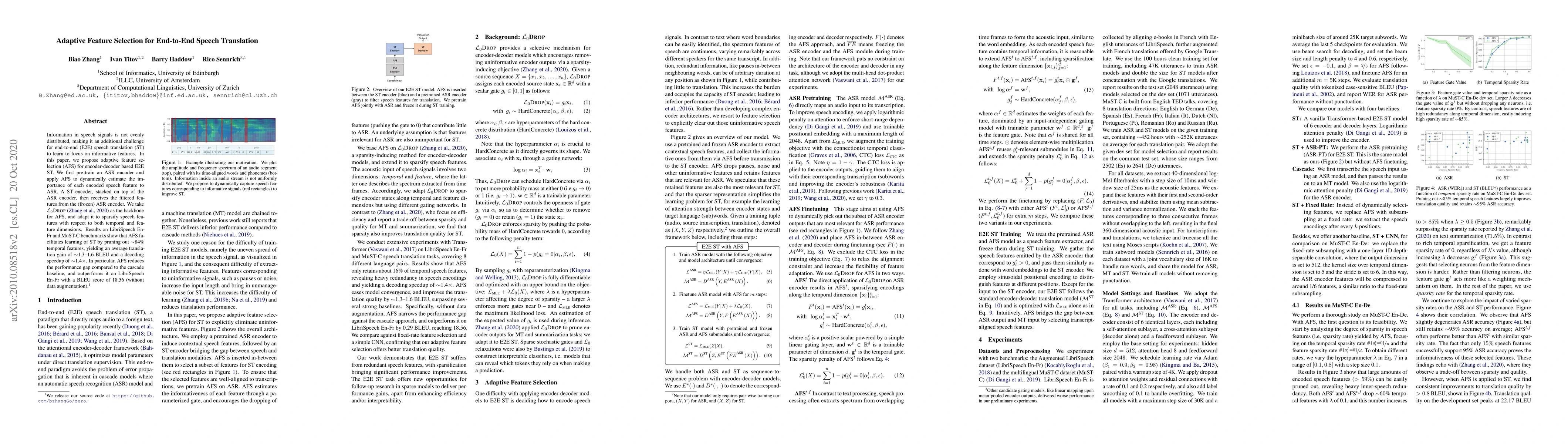 This paper proposes adaptive feature selection (AFS) for end-to-end speech translation, using L0DROP to dynamically estimate and prune less informative speech features. Results show an average translation gain of 1.3-1.6 BLEU and a 1.4x decoding speedup on LibriSpeech En-Fr and MuST-C benchmarks.