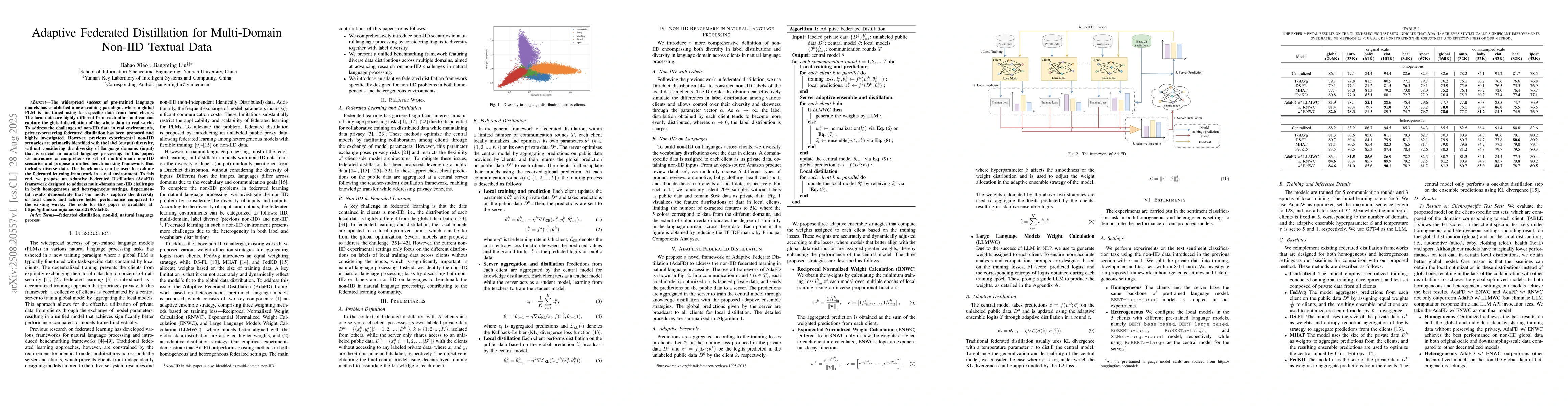 The widespread success of pre-trained language models has established a new training paradigm, where a global PLM is fine-tuned using task-specific data from local clients. The local data are highly different from each other and can not capture the global distribution of the whole data in real world. To address the challenges of non-IID data in real environments, privacy-preserving federated distillation has been proposed and highly investigated. However, previous experimental non-IID scenarios are primarily identified with the label (output) diversity, without considering the diversity of language domains (input) that is crucial in natural language processing. In this paper, we introduce a comprehensive set of multi-domain non-IID scenarios and propose a unified benchmarking framework that includes diverse data. The benchmark can be used to evaluate the federated learning framework in a real environment. To this end, we propose an Adaptive Federated Distillation (AdaFD) framework designed to address multi-domain non-IID challenges in both homogeneous and heterogeneous settings. Experimental results demonstrate that our models capture the diversity of local clients and achieve better performance compared to the existing works. The code for this paper is available at: https://github.com/jiahaoxiao1228/AdaFD.