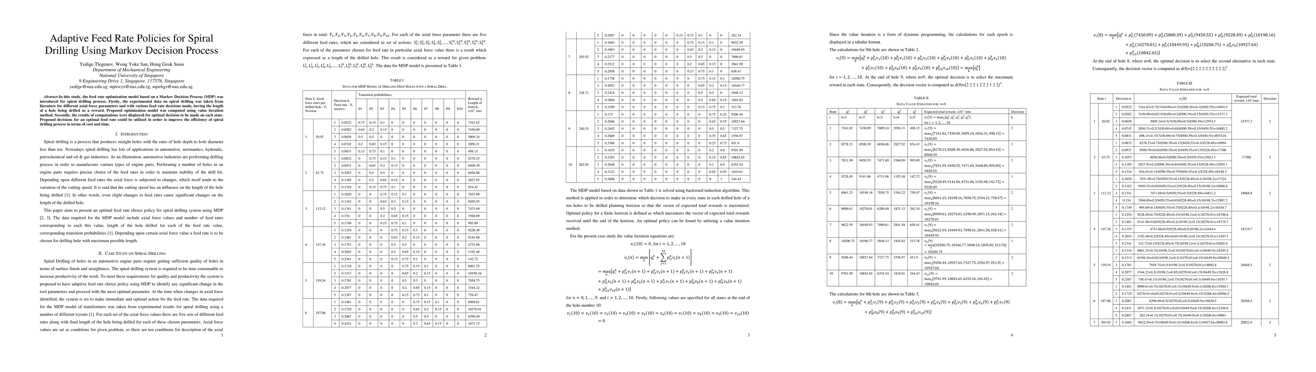 In this study, the feed rate optimization model based on a Markov Decision Process (MDP) was introduced for spiral drilling process. Firstly, the experimental data on spiral drilling was taken from literature for different axial force parameters and with various feed rate decisions made, having the length of a hole being drilled as a reward. Proposed optimization model was computed using value iteration method. Secondly, the results of computations were displayed for optimal decision to be made on each state. Proposed decisions for an optimal feed rate could be utilized in order to improve the efficiency of spiral drilling process in terms of cost and time.