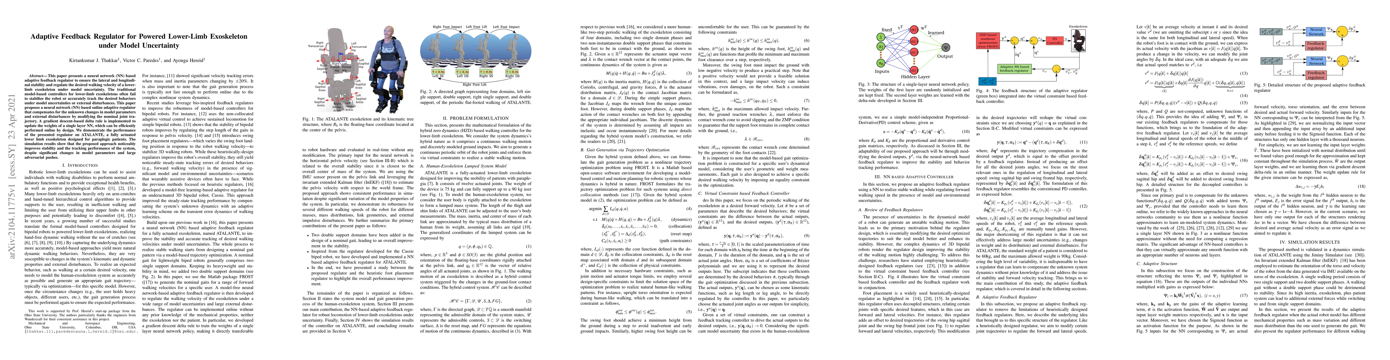 This paper introduces a neural network-based adaptive feedback regulator to enhance the stability and velocity regulation of a powered lower-limb exoskeleton under model uncertainty, demonstrating improved performance through simulations on the ATALANTE exoskeleton. The neural network updates its weights online using a gradient descent-based delta rule to compensate for model changes and disturbances.