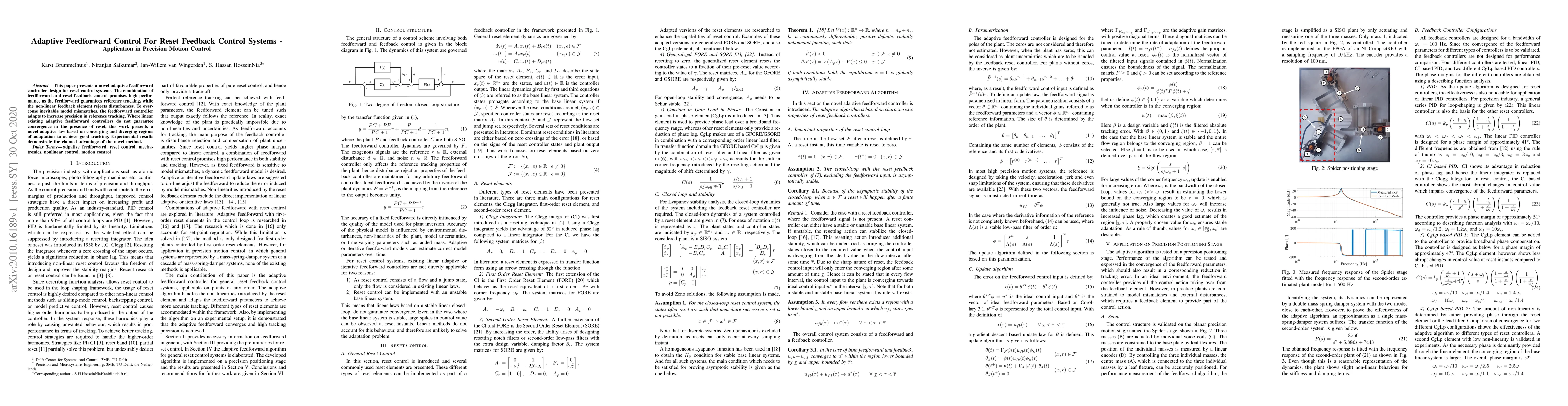 This paper introduces an adaptive feedforward controller for reset feedback control systems, enhancing precision in motion control by combining feedforward tracking and reset feedback disturbance rejection. The novel adaptive law addresses model mismatches and ensures convergence, outperforming existing linear adaptive methods.