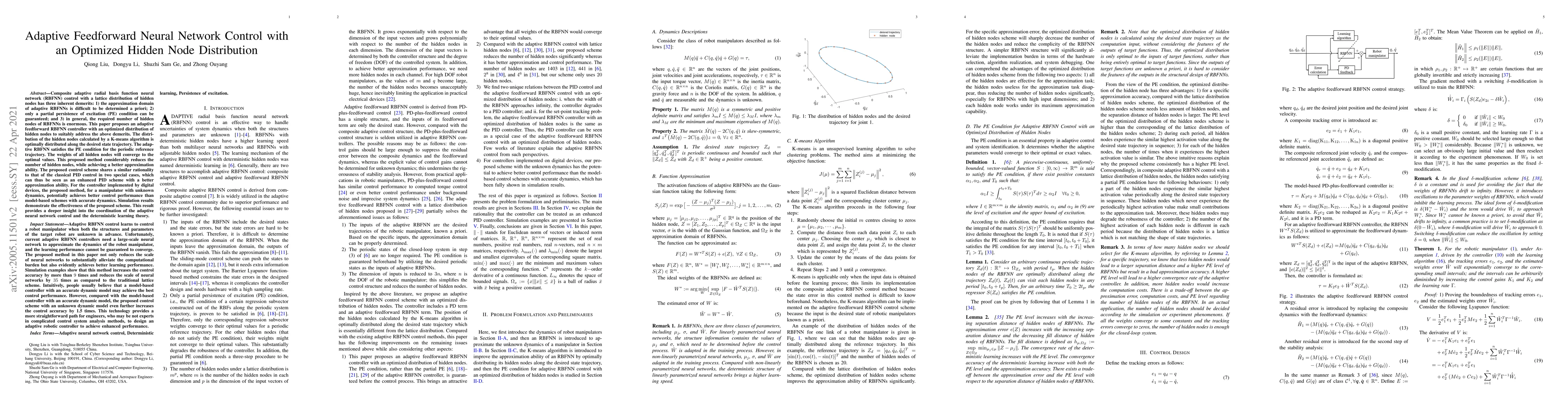 This paper proposes an adaptive feedforward radial basis function neural network (RBFNN) controller with an optimized hidden node distribution to address the challenges of determining the approximation domain, ensuring the persistence of excitation condition, and reducing the number of hidden nodes. The K-means algorithm optimizes node distribution along the desired state trajectory, achieving better approximation ability and control performance compared to traditional PID schemes.