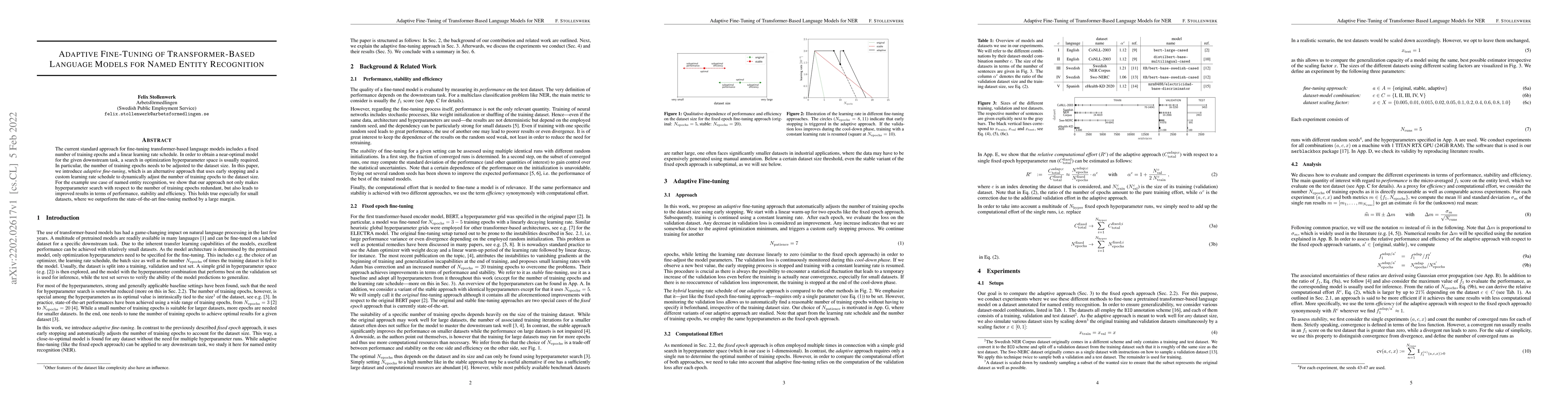 This paper proposes adaptive fine-tuning for transformer-based language models, which dynamically adjusts training epochs using early stopping and a custom learning rate schedule. This method improves performance, stability, and efficiency, especially for named entity recognition on small datasets, outperforming existing methods.