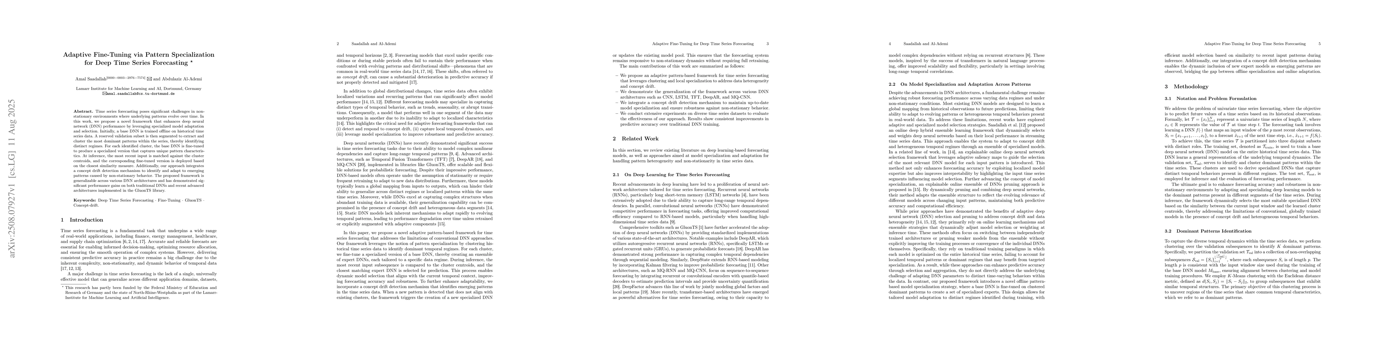 The research proposes a novel framework for adaptive fine-tuning of deep neural networks (DNNs) in time series forecasting by leveraging specialized model adaptation and selection. It involves training a base DNN offline on historical data, segmenting a reserved validation subset to extract and cluster dominant patterns, fine-tuning the base DNN for each cluster to produce specialized versions, and deploying the most similar specialized model for inference based on the closest similarity measure to cluster centroids.