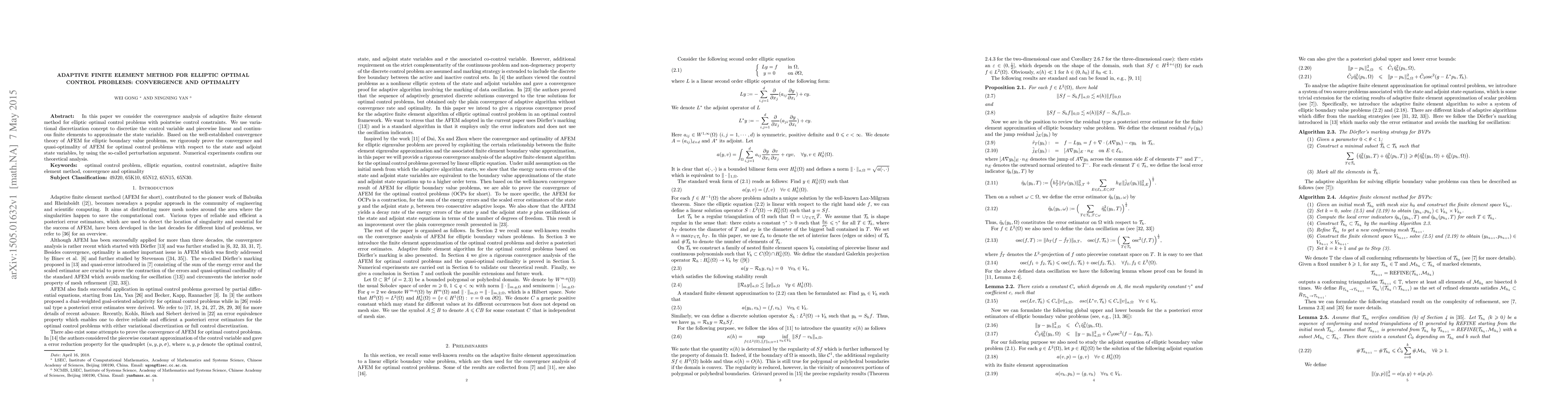 This paper investigates the convergence and optimality of an adaptive finite element method (AFEM) for elliptic optimal control problems, utilizing variational discretization and continuous finite elements. Theoretical analysis proves the method's convergence and quasi-optimality, confirmed by numerical experiments.