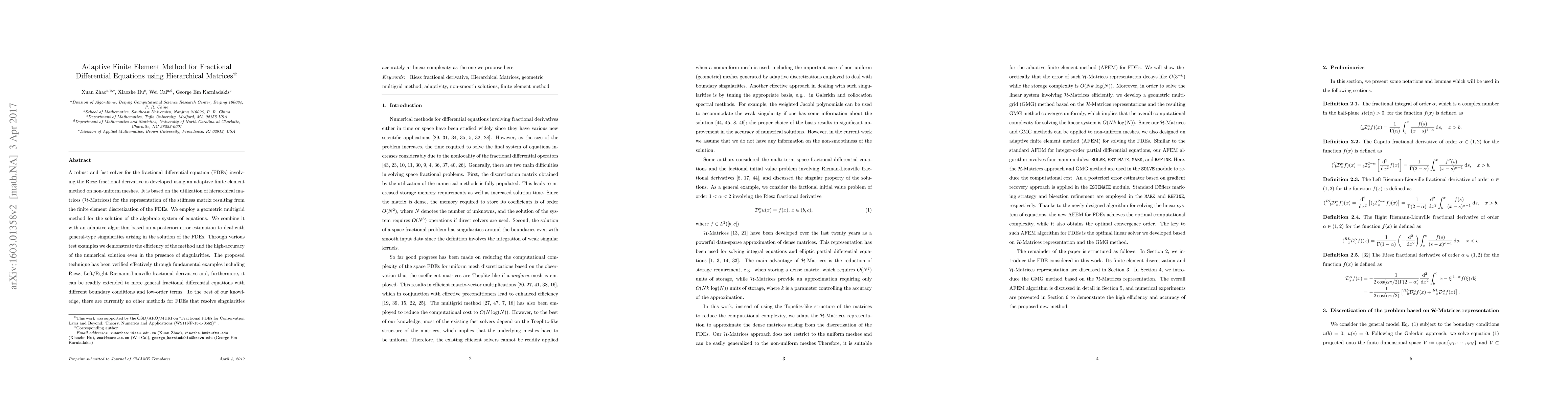 This paper develops an adaptive finite element method for solving fractional differential equations using hierarchical matrices, combining it with a geometric multigrid method and an adaptive algorithm for high accuracy and efficiency, even in the presence of singularities. The method's effectiveness is demonstrated through various test cases, showing its potential for broader application to different fractional differential equations.