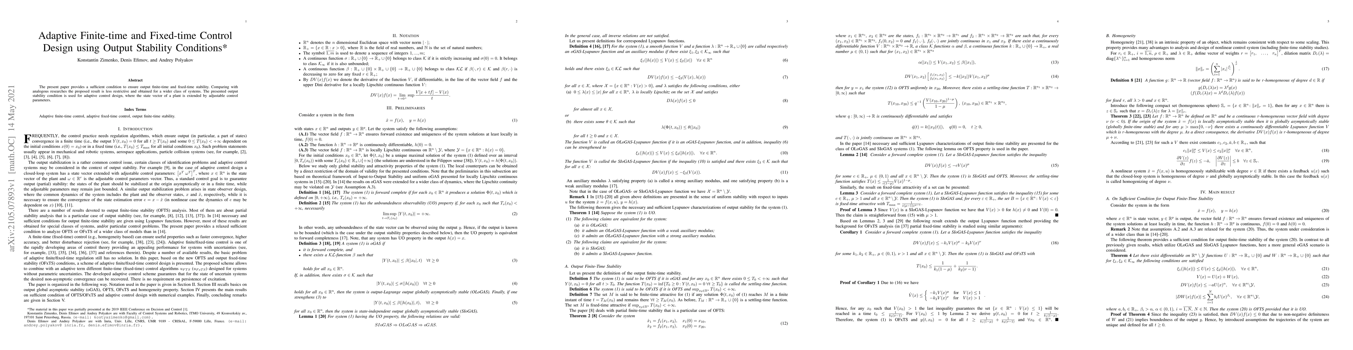 Summary: This paper introduces a less restrictive condition for output finite-time and fixed-time stability applicable to a broader class of systems. It utilizes this condition for adaptive control design, extending the plant's state vector with adjustable control parameters.