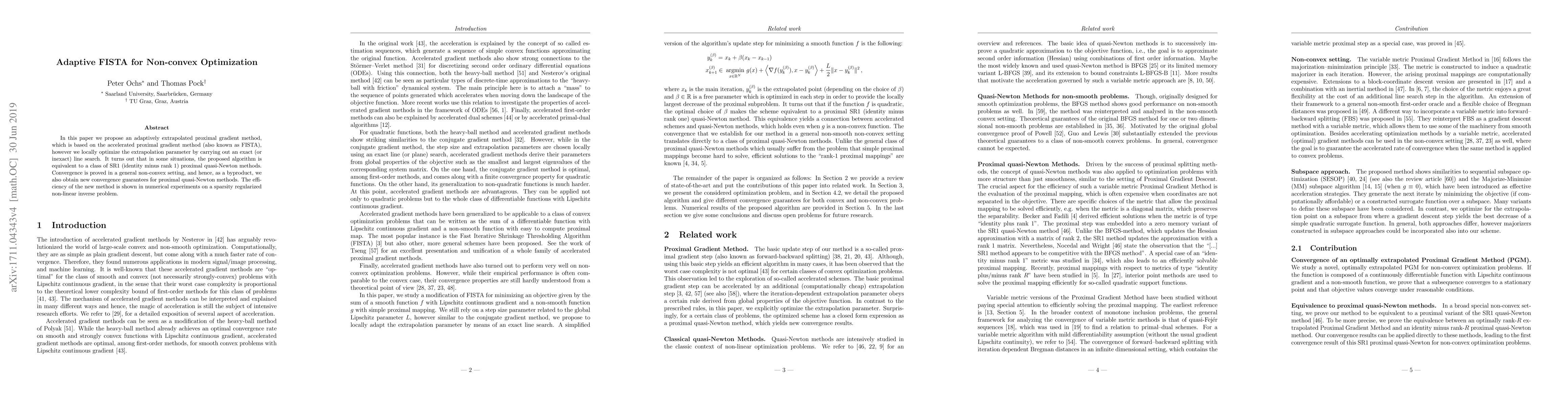 This paper proposes an adaptively updated FISTA method for non-convex optimization that combines local line search with accelerated gradient descent for improved efficiency.