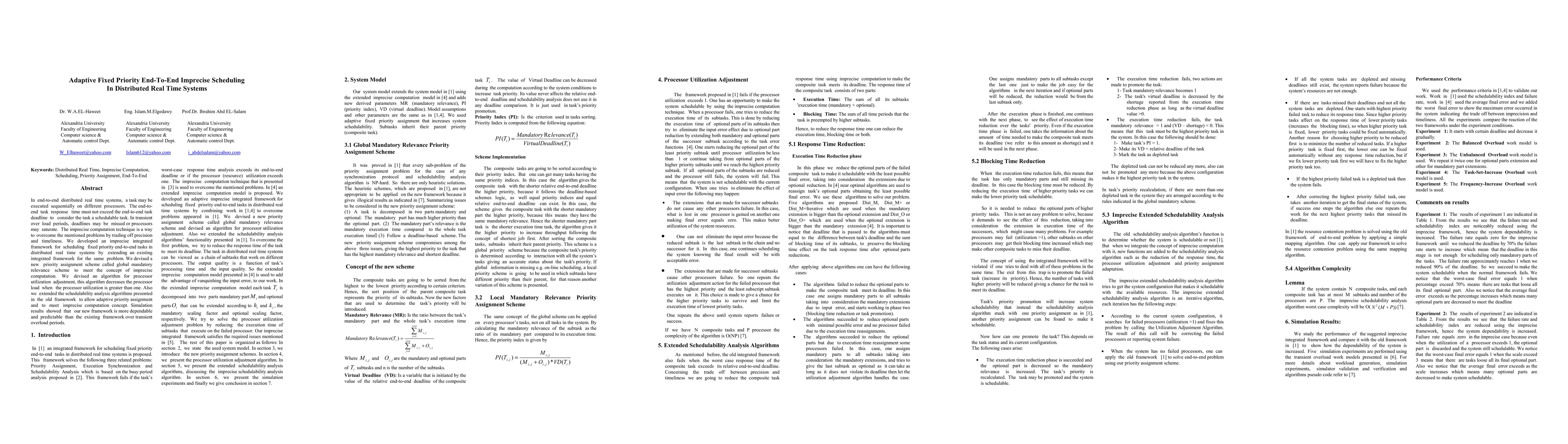 In end-to-end distributed real time systems, a task may be executed sequentially on different processors. The end-toend task response time must not exceed the end-to-end task deadline to consider the task a schedulable task. In transient over load periods, deadlines may be missed or processors may saturate. The imprecise computation technique is a way to overcome the mentioned problems by trading off precision and timeliness. We developed an imprecise integrated framework for scheduling fixed priority end-to-end tasks in distributed real time systems by extending an existing integrated framework for the same problem. We devised a new priority assignment scheme called global mandatory relevance scheme to meet the concept of imprecise computation. We devised an algorithm for processor utilization adjustment, this algorithm decreases the processor load when the processor utilization is greater than one. Also we extended the schedulability analysis algorithms presented in the old framework to allow adaptive priority assignment and to meet imprecise computation concept. Simulation results showed that our new framework is more dependable and predictable than the existing framework over transient overload periods.