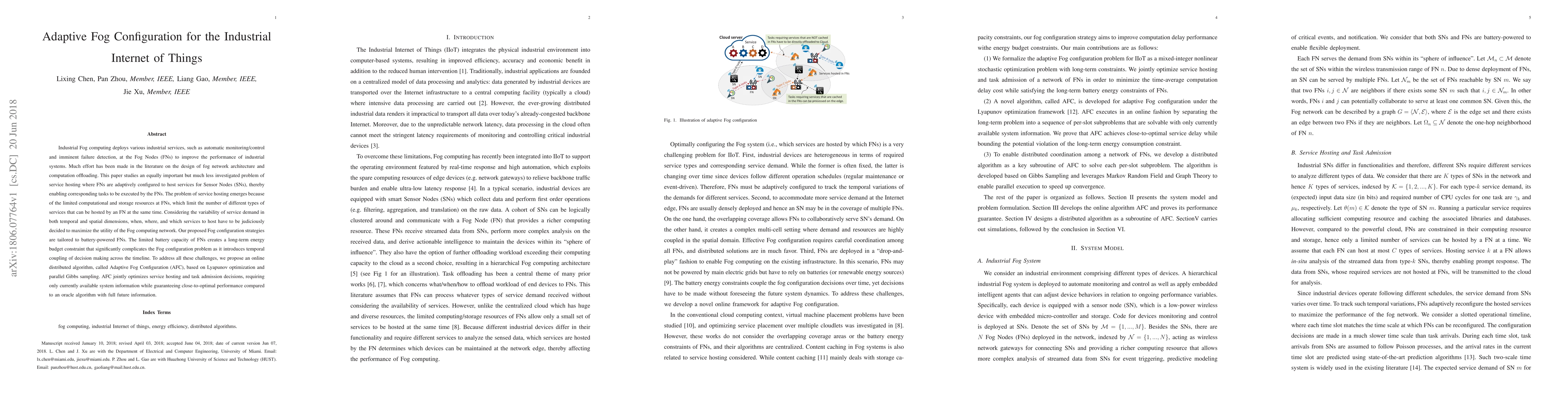 This paper proposes Adaptive Fog Configuration (AFC) to adaptively manage service hosting in industrial Fog computing, addressing resource limitations and energy constraints of Fog Nodes (FNs). The online distributed AFC algorithm leverages Lyapunov optimization and parallel Gibbs sampling to optimize service hosting and task admission decisions based on current system information.