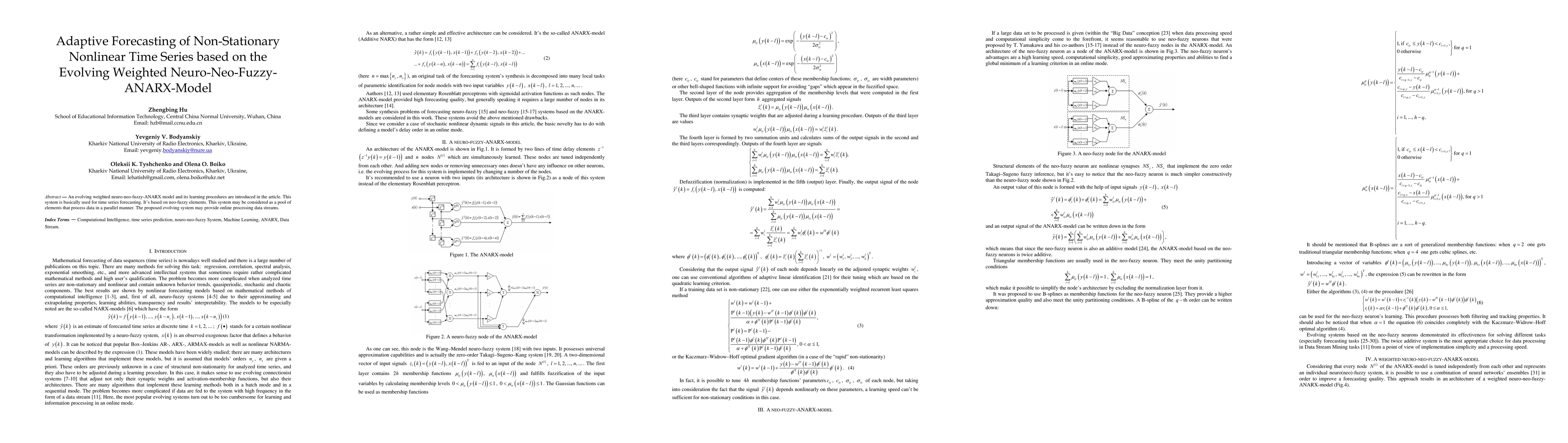 Summary: This paper introduces an evolving weighted neuro-neo-fuzzy-ANARX model for adaptive forecasting of non-stationary nonlinear time series, utilizing parallel processing and online learning to handle data streams effectively.